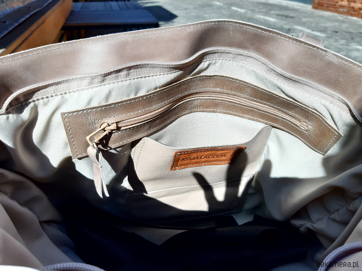 Wewnątrz podszewka , w środku kieszeń zapinana na zamek oraz mniejsza na telefon.