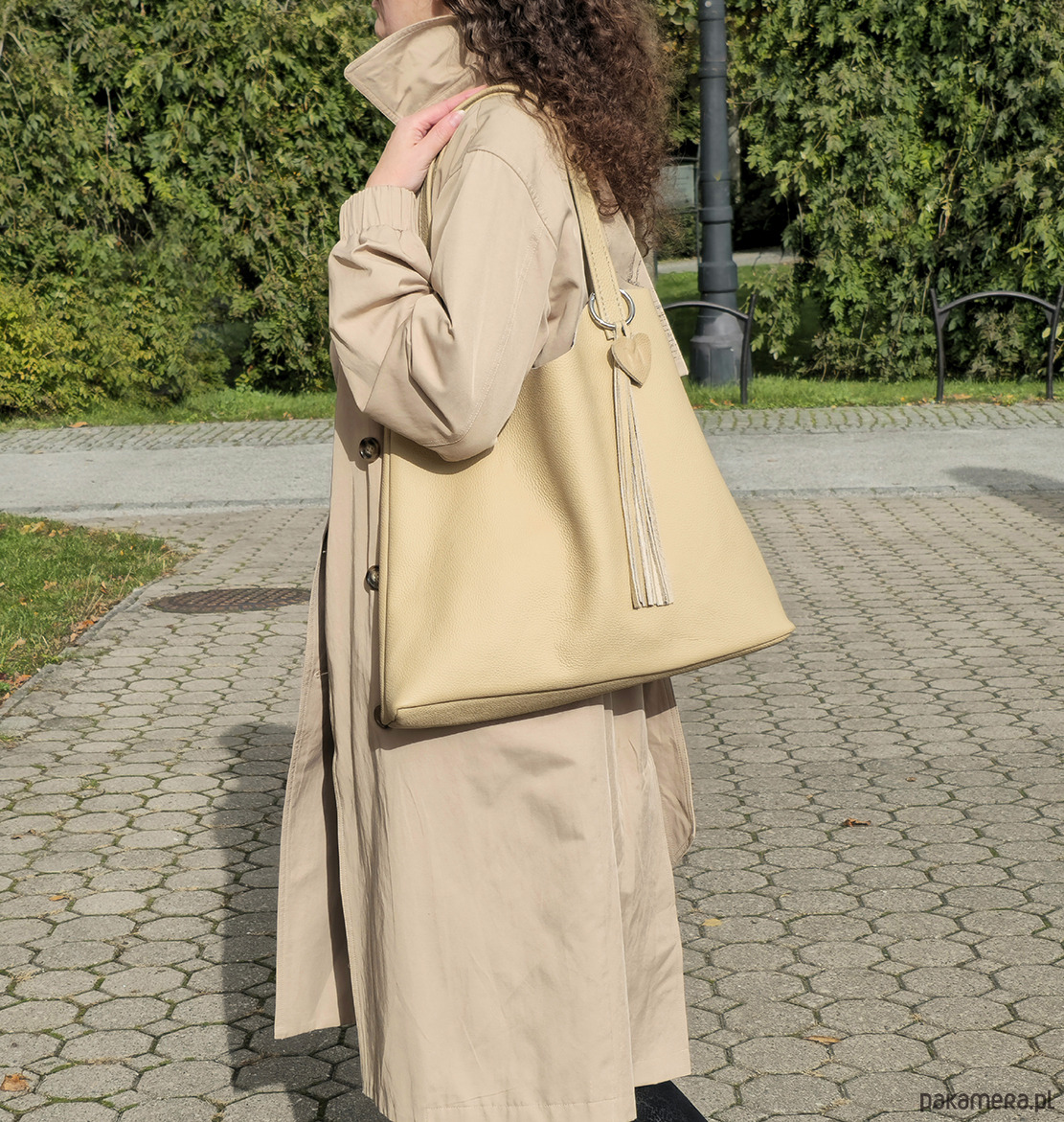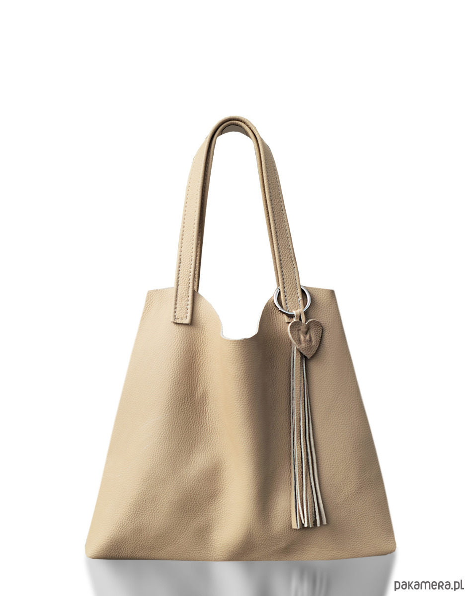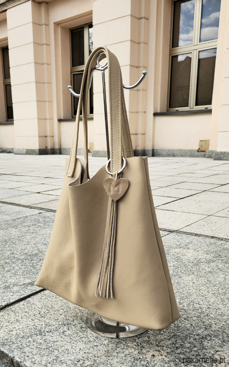 Torebka z miękkiej skóry o strukturze "groszek" w kolorze beżowym.