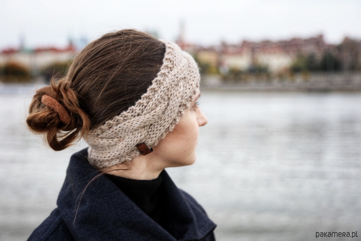 Beżowa wełniana opaska warkoczowa to produkt wykonany na drutach z miękkiej, 100% wełny peruwiańskiej w kolorze jasnego beżu.