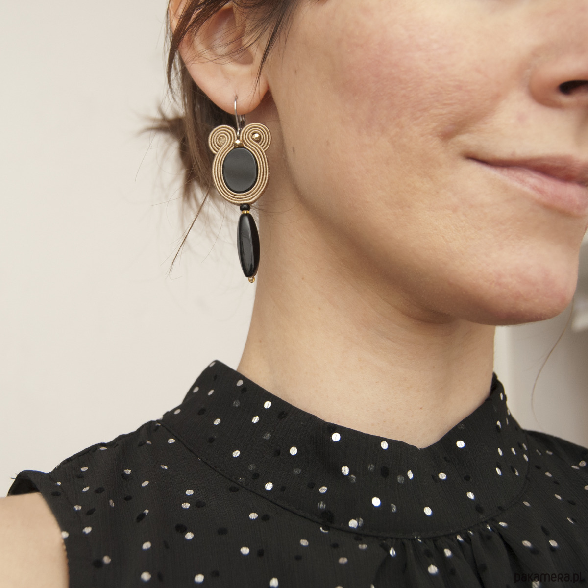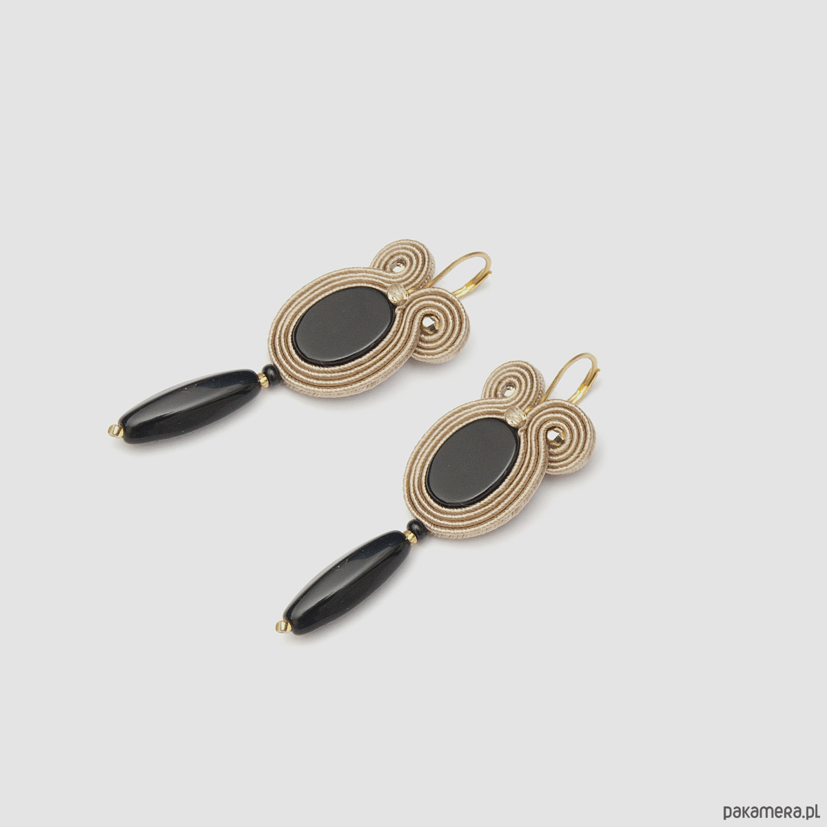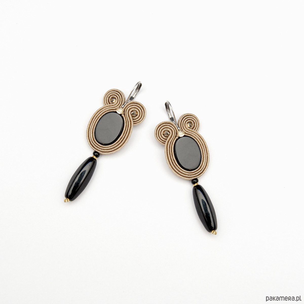 "Beżowe kolczyki sutasz małe " wykonane są techniką haftu sutasz. Zrobione z kamieni półszlachetnych (czarny onyks), koralików szklanych, sznurków sutasz i bigli ze stali chirurgicznej w kolorze złotym lub srebrnym - do wyboru (antyalergiczna). Tył kolczyków stanowi skóra naturalna. Długość kolczyka to około 6 cm, szerokość w najszerszym miejscu wynosi około 2 cm.