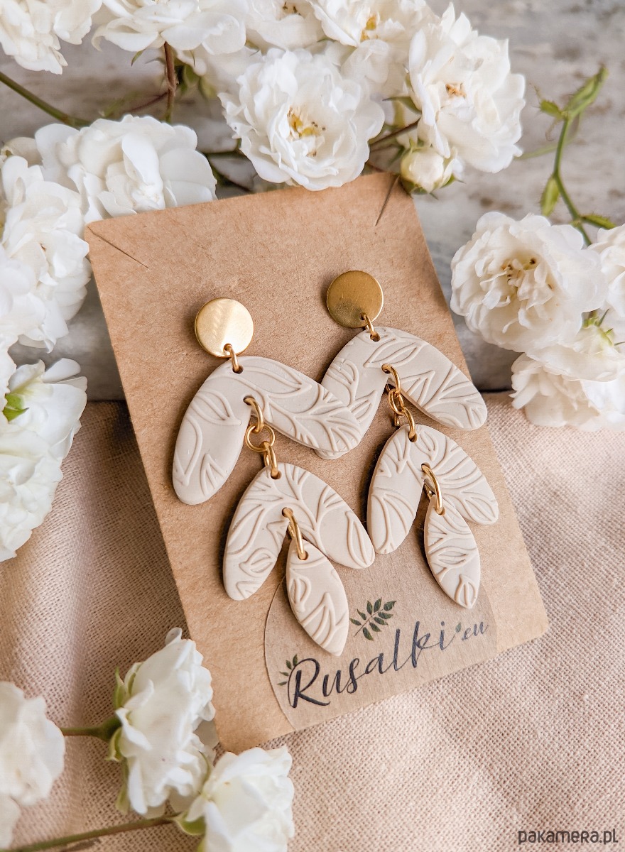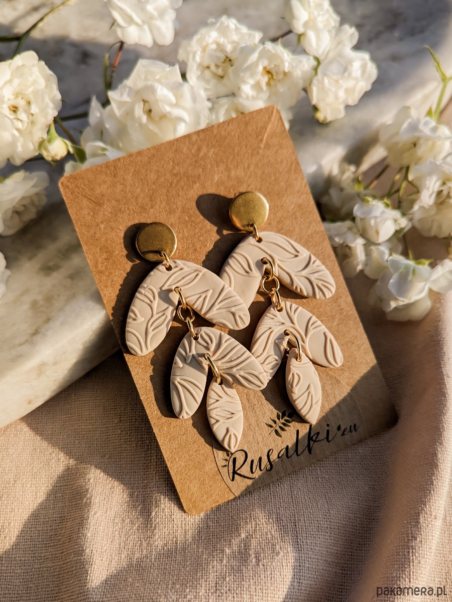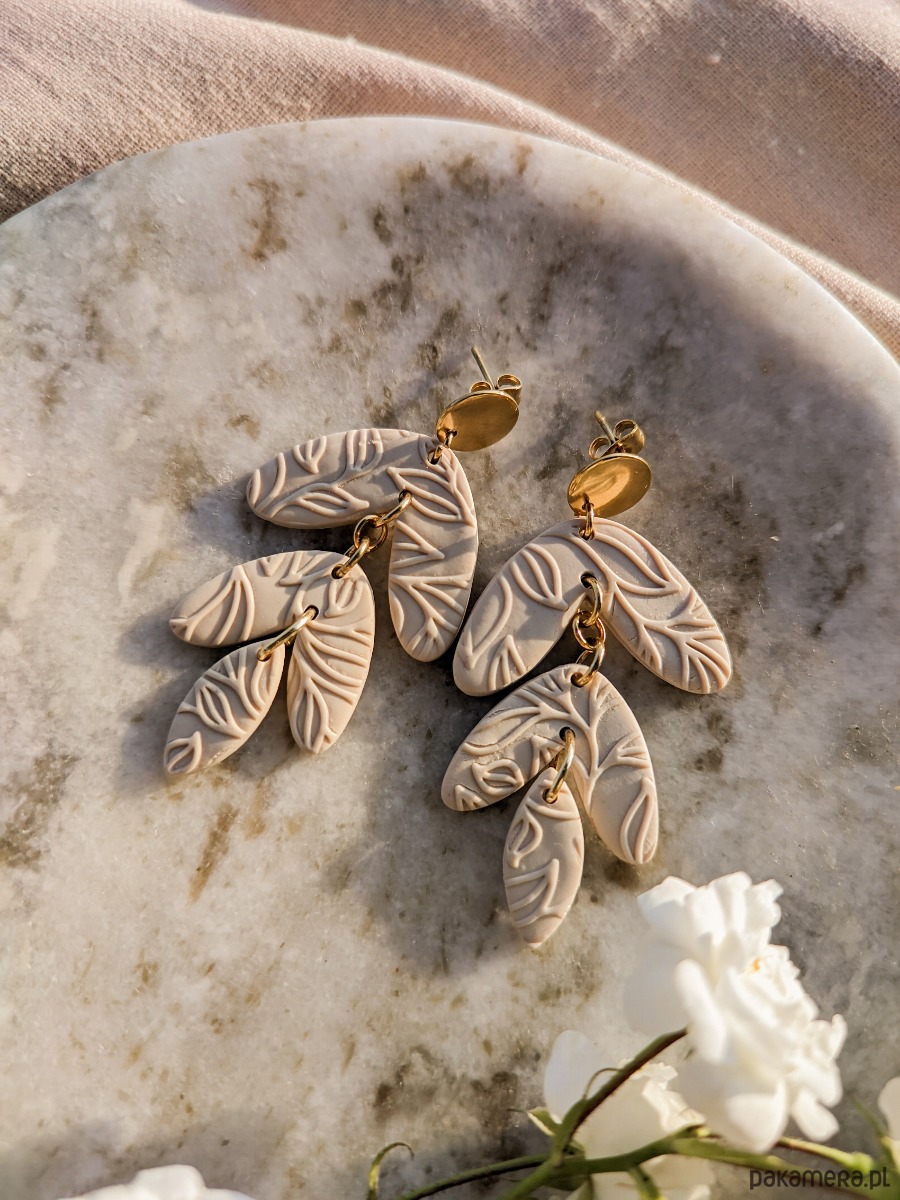 Beżowe lekkie kolczyki z gliny polimerowej, z rustykalnym wzorem