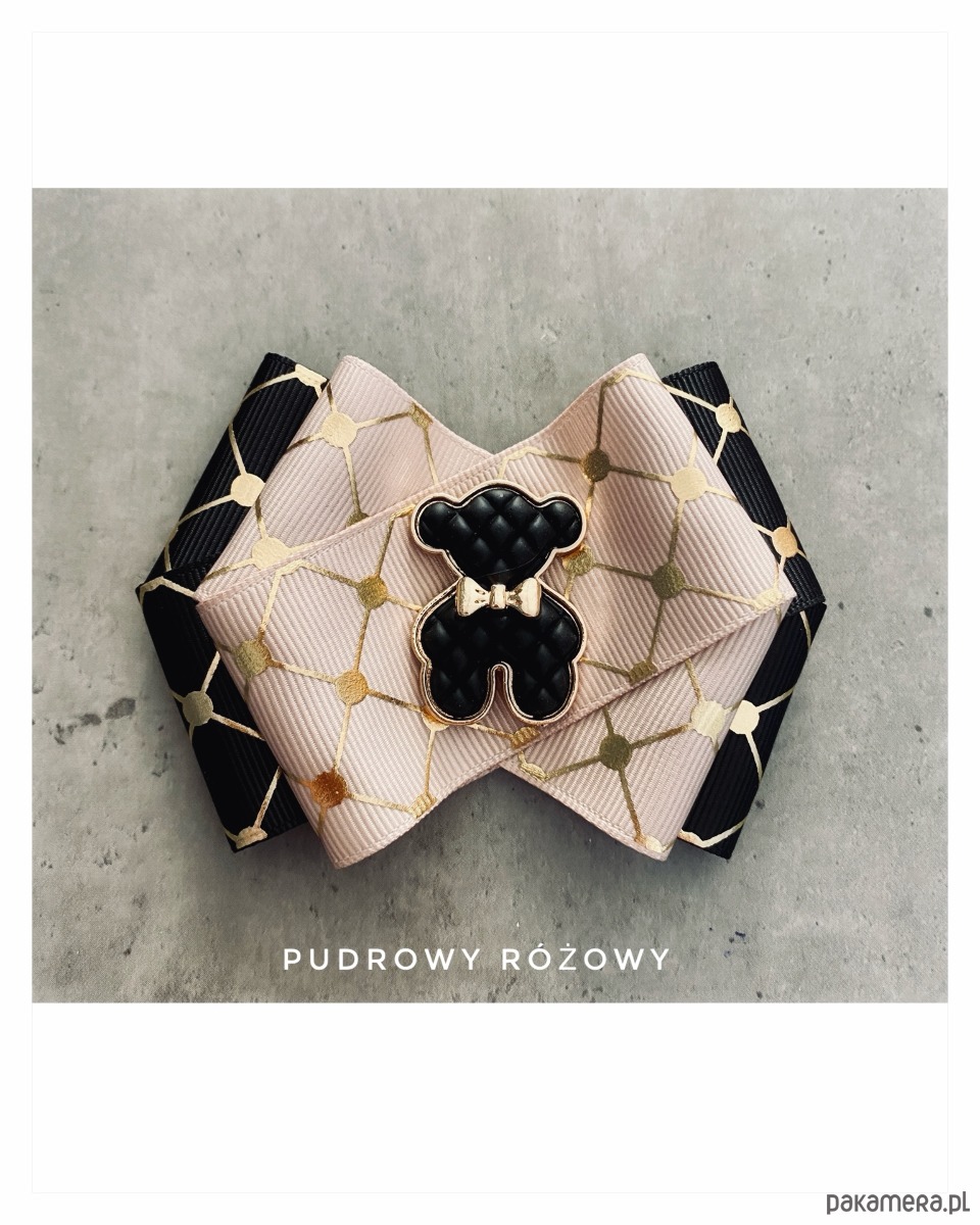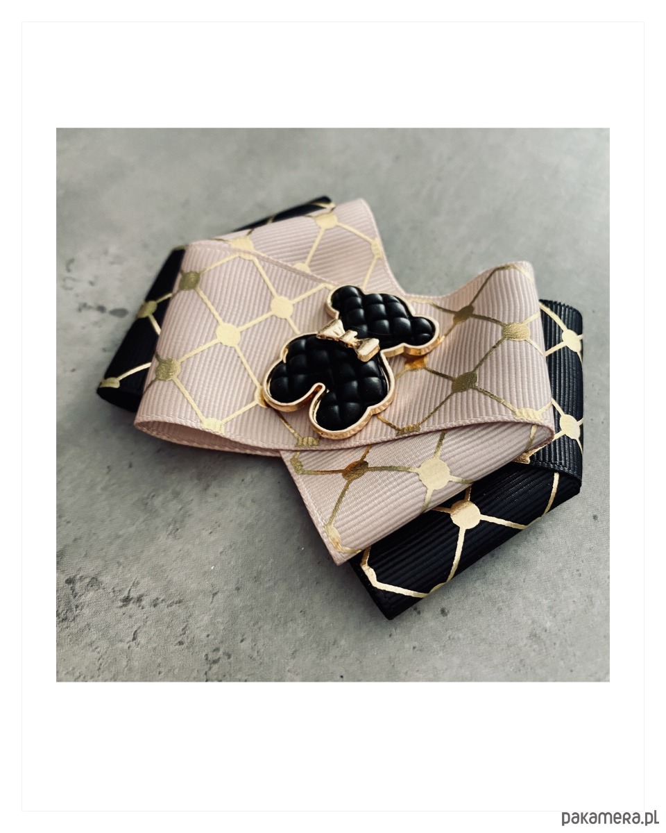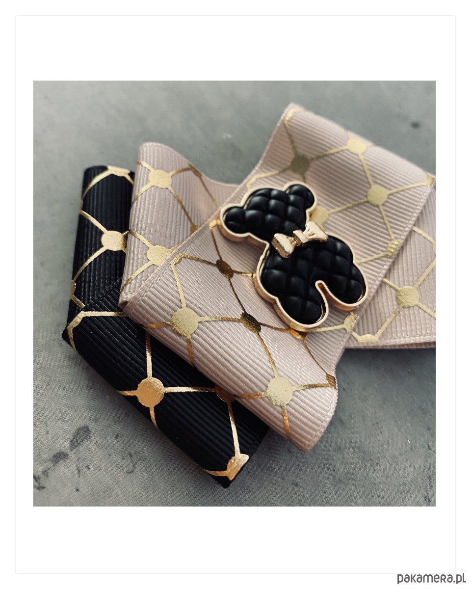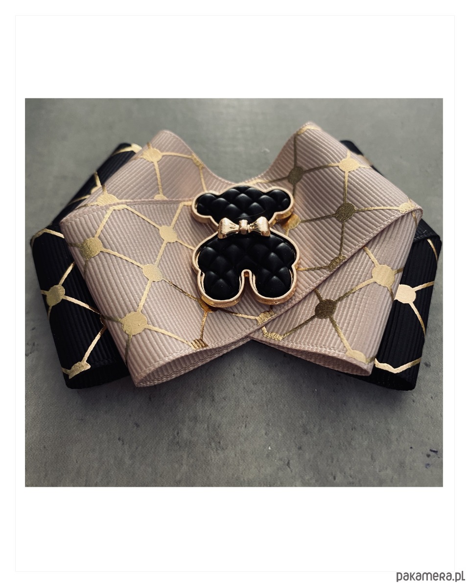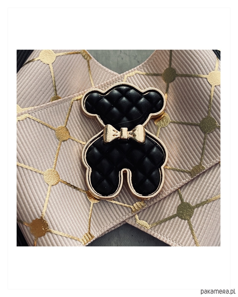 Cudowny Miś wykonany z ciekawej kratkowanej masy w kolorze czarnym urocza złota kokardka.