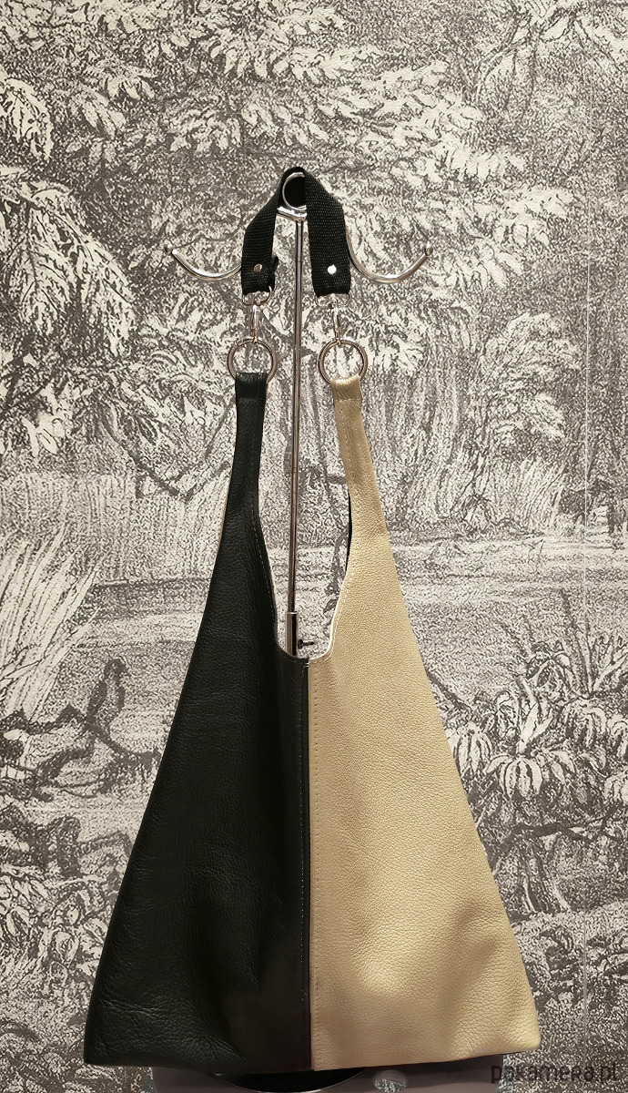 Torba na ramię wykonana z połączenia dwóch kolorów skóry naturalnej o strukturze groszek- czarnej i beżowej.