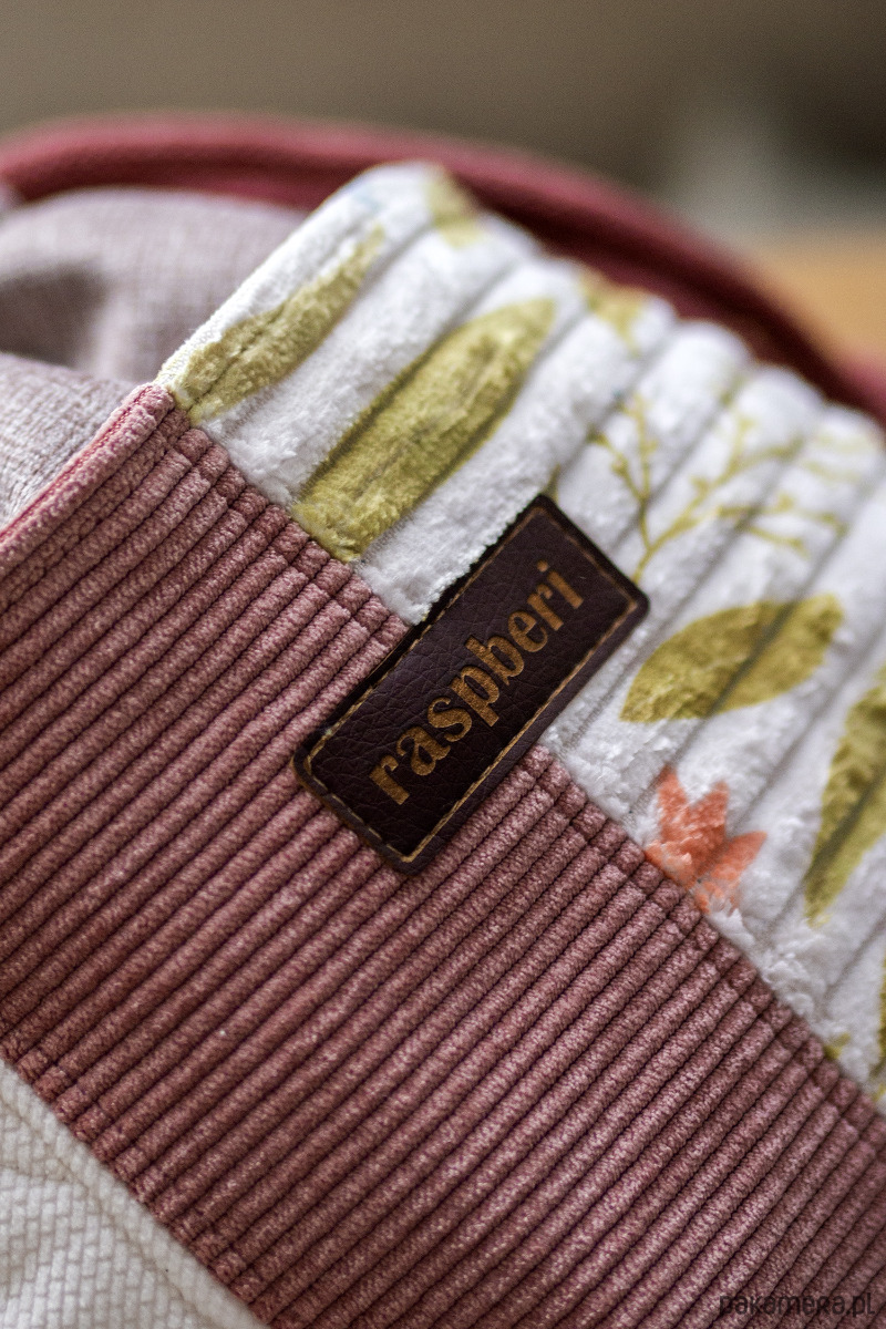 Wykonana z beżowego weluru. Z przodu oraz z na tyle torebki kieszenie (np. na telefon czy chusteczki) w stylu patchworkowym. W środku kieszonka zapinana na suwak.