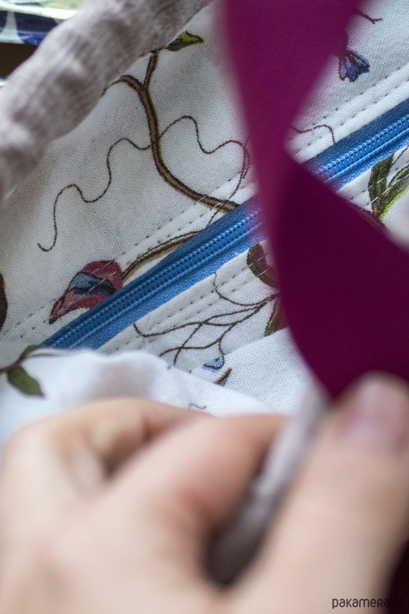 Całość ściągana grubym, bawełnianym sznurkiem w kolorze różowym.