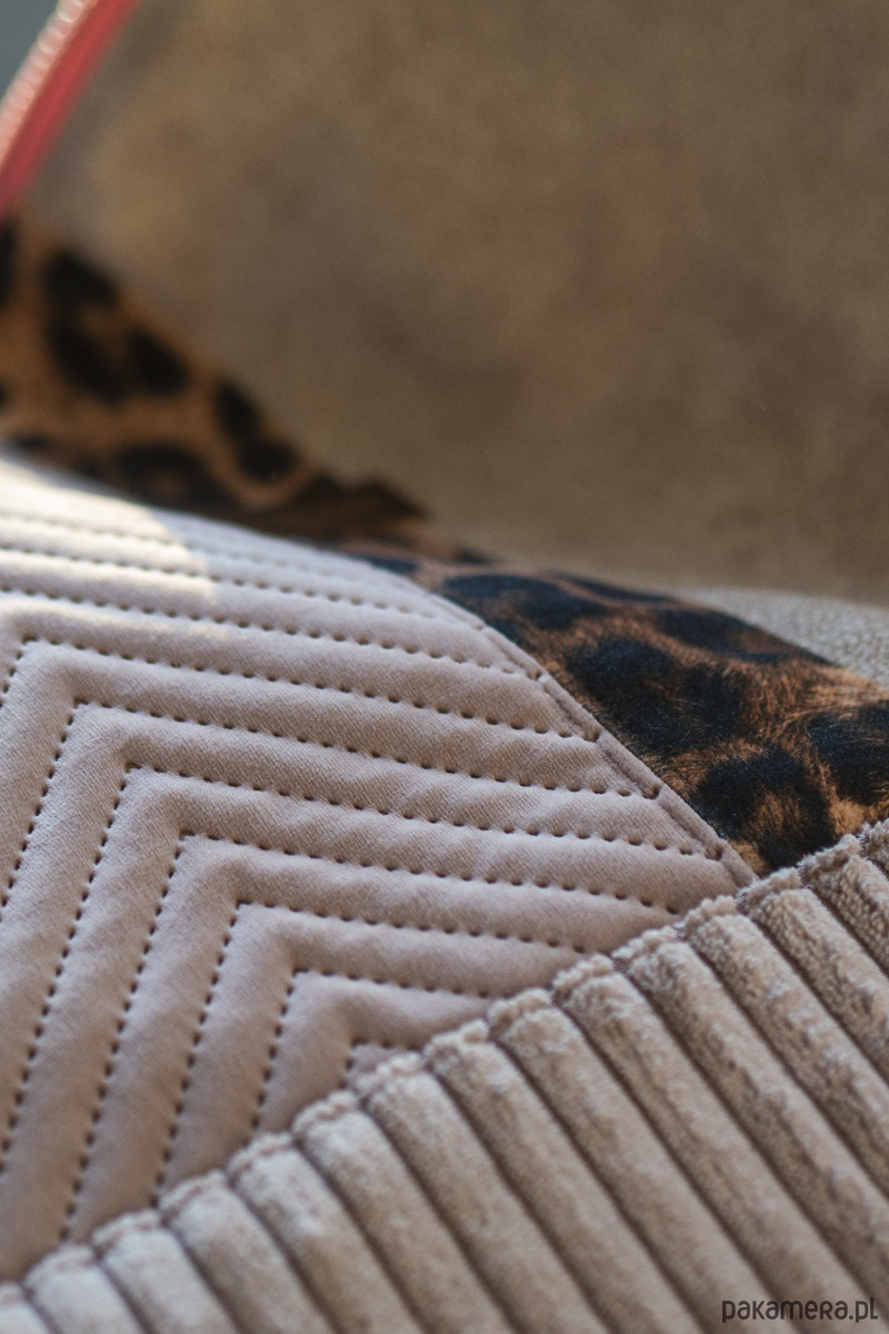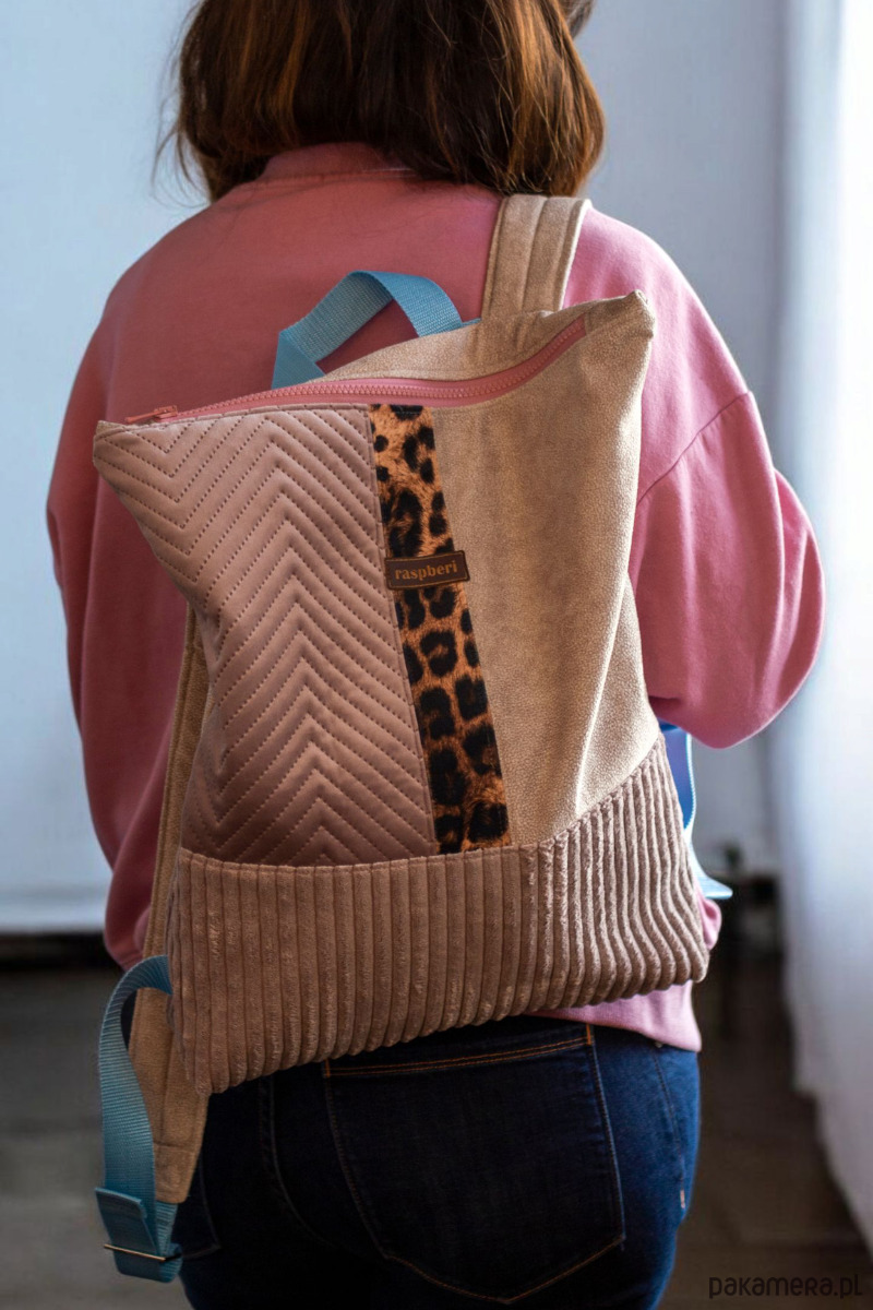 Duży, damski plecak miejski zapinany na suwak z kilku rodzajów kolorowych tkanin w połączeniu z welurem w panterkę.