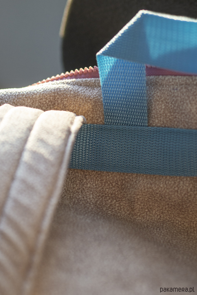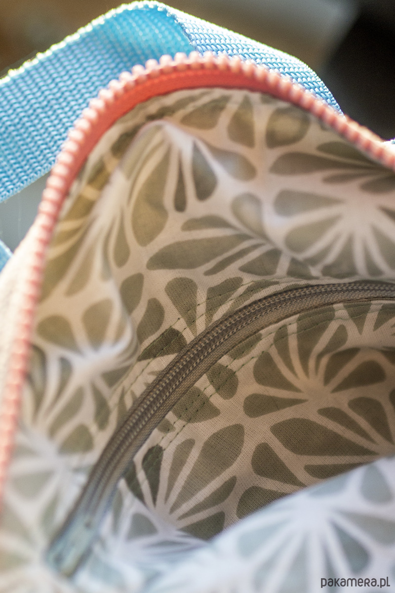 Regulowane paski. W środku wzorzysta, bawełniana podszewka oraz mała kieszonka na suwak.