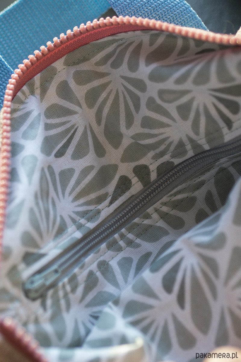 Regulowane paski. W środku wzorzysta, bawełniana podszewka oraz mała kieszonka na suwak.