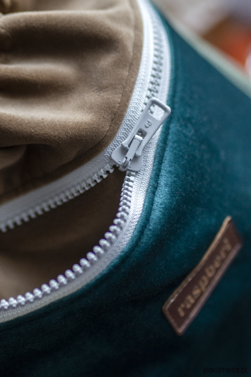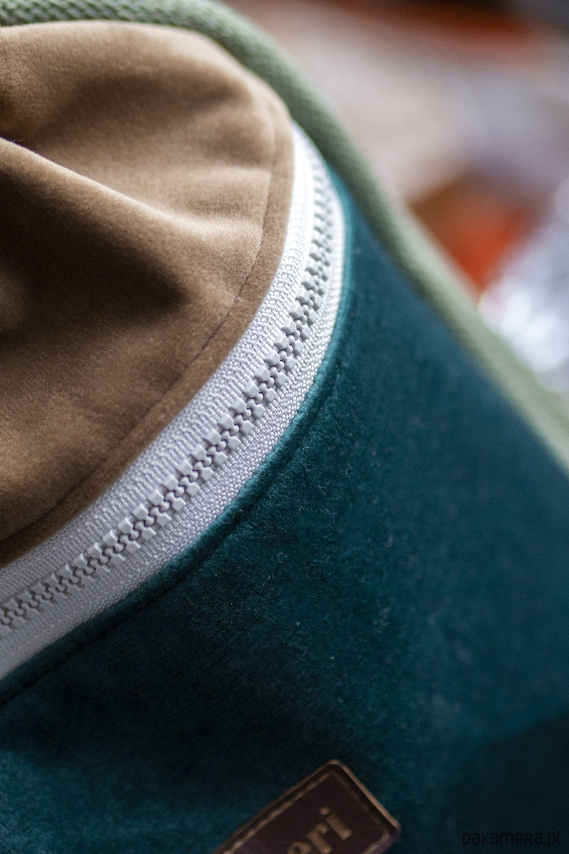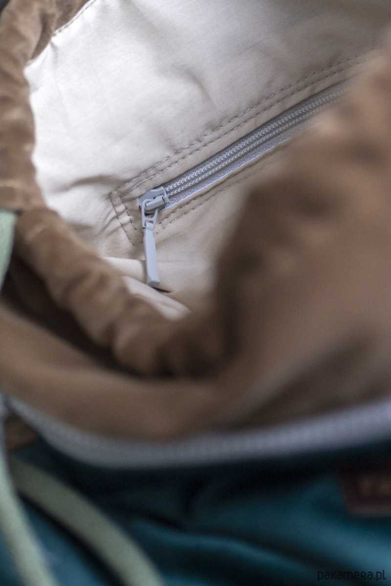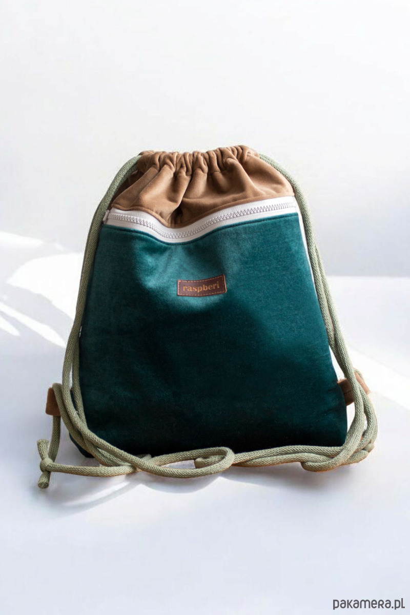 Plecak worek wykonany z grubego jasnobrązowego weluru. Z przodu duża kieszeń zapinana na suwak z weluru w kolorze zielonym. Z tyłu plecaka (z boku, na dole) mała zapinana kieszonka.