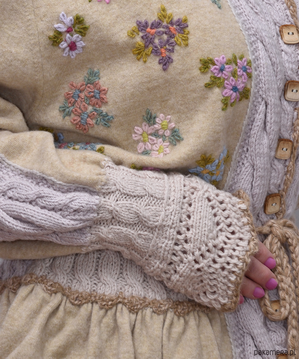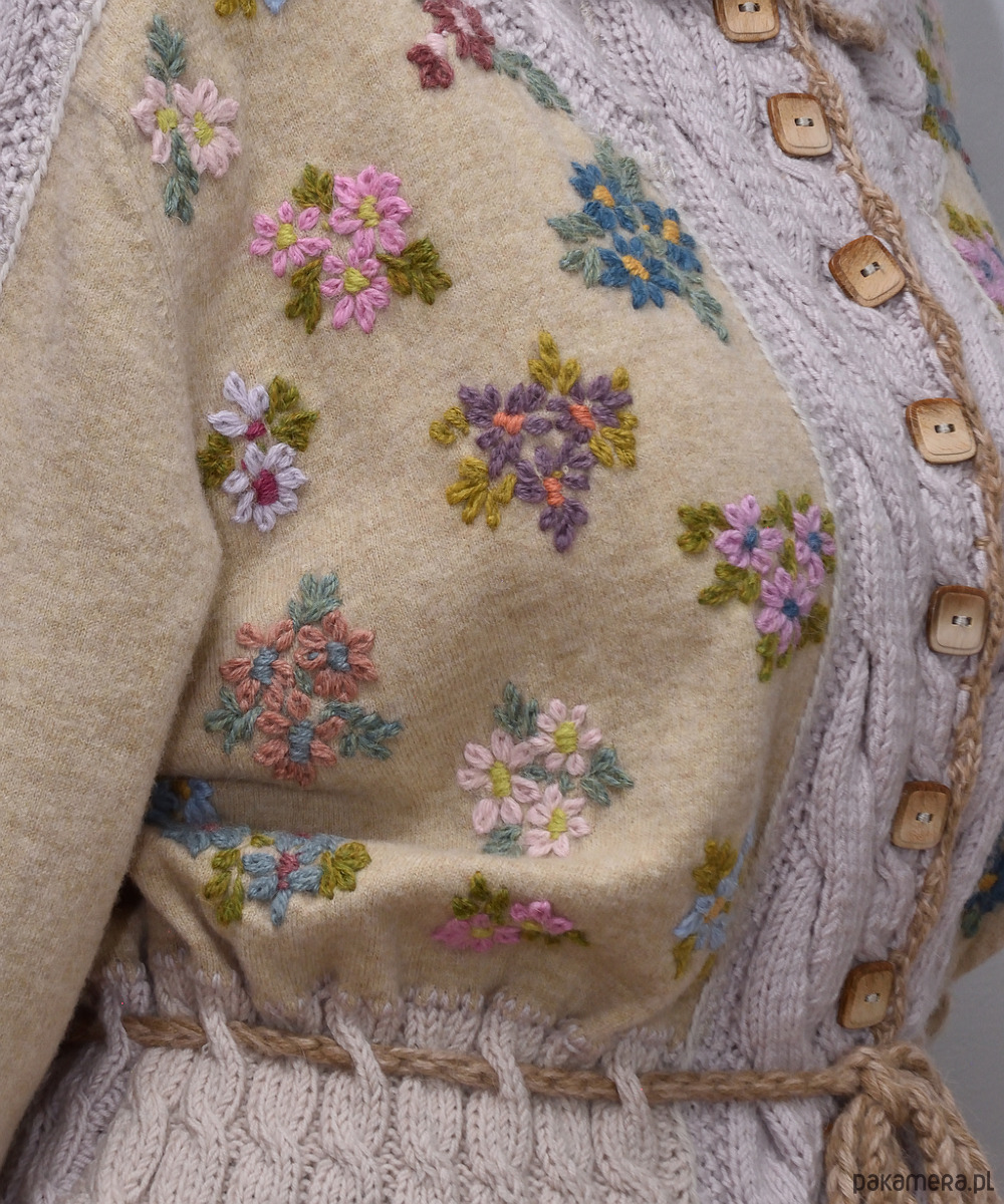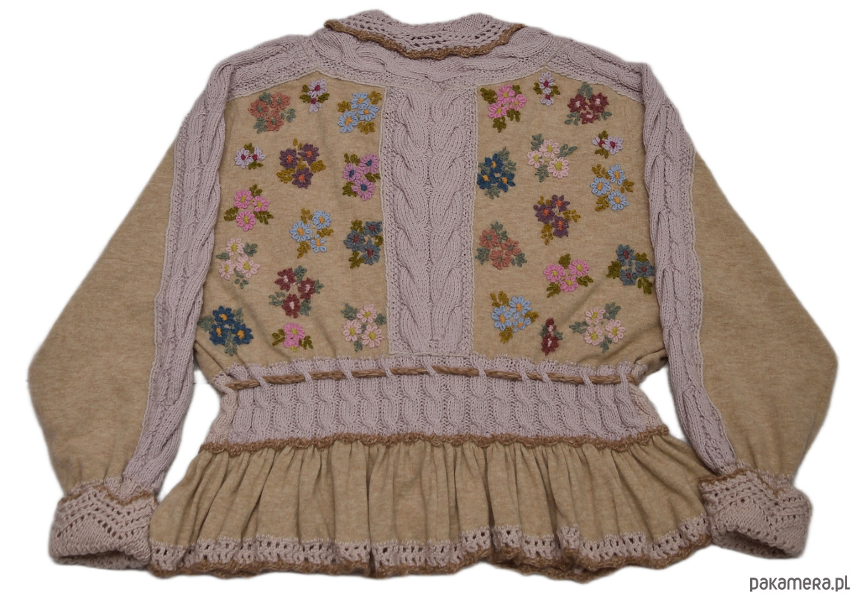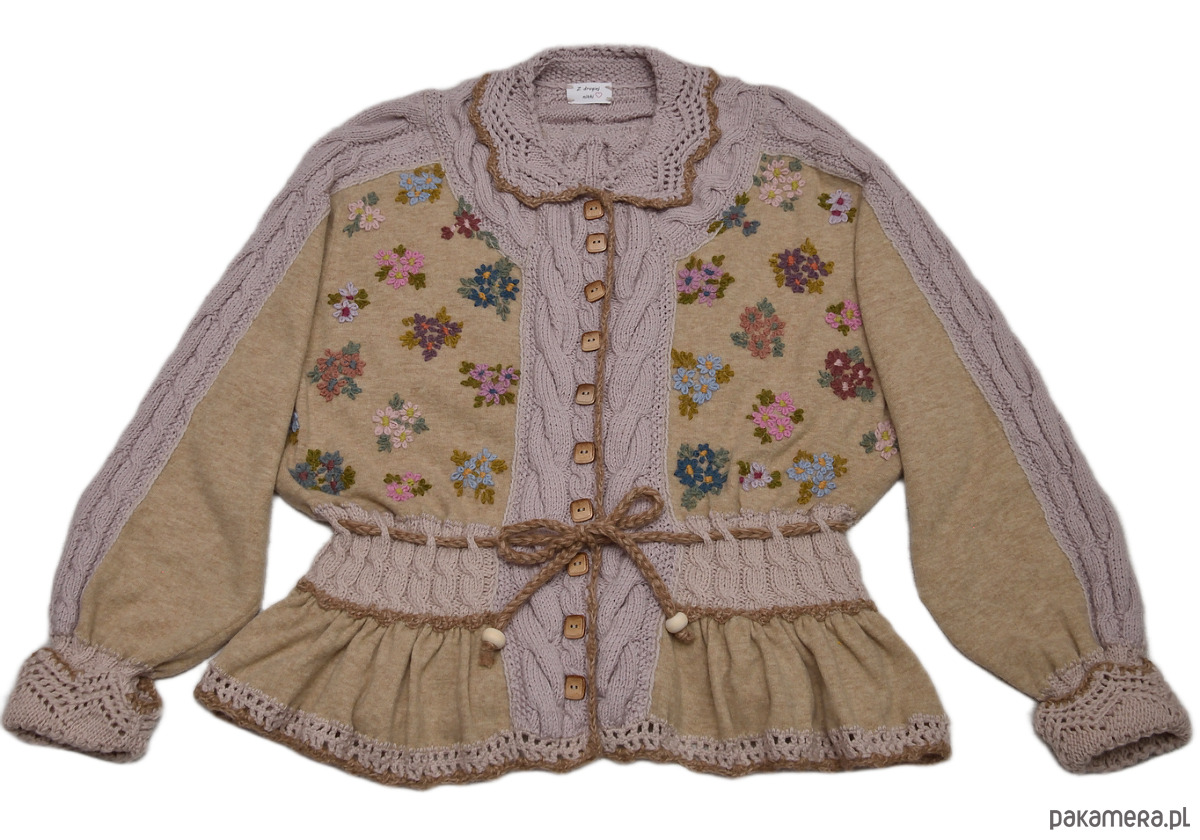 Ten beżowy kardigan z haftami i falbanką, może być Twoim ulubionym swetrem na wiosnę. To za sprawą kolorowych kwiatów wyhaftowanych ręcznie oraz kompozycji warkoczy i ażurów składających się na części przodu, tyłu, rękawów, kołnierzyk i mankiety. Miękka i przyjemna w dotyku dzianina, pochodzi z drugiego obiegu i zawiera 100% wełny merino. Pozostałe części kardiganu wydziergano ręcznie z włóczki merino baby (100%). Do haftowania użyto 100% alpaki. Dziewczęcego uroku i lekkości nadaje mu wiązanie w talii oraz falbanka zdobiąca dół swetra. Brzegi kołnierzyka, mankietów i falbanki wykończono szydełkiem wzorem muszelkowym. Sweter posiada luźny krój. Będzie dobrze prezentował się na każdej sylwetce. Może być noszony jako okrycie wierzchnie. Swobodnie zmieści się także pod płaszcz czy kurtkę.