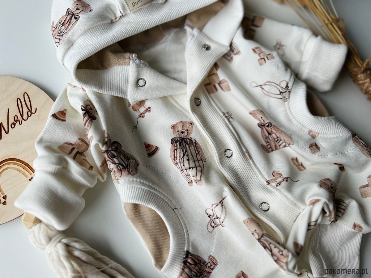 Beżowy kombinezon dresowy dla chłopca wzory misie
