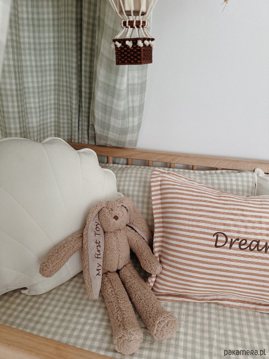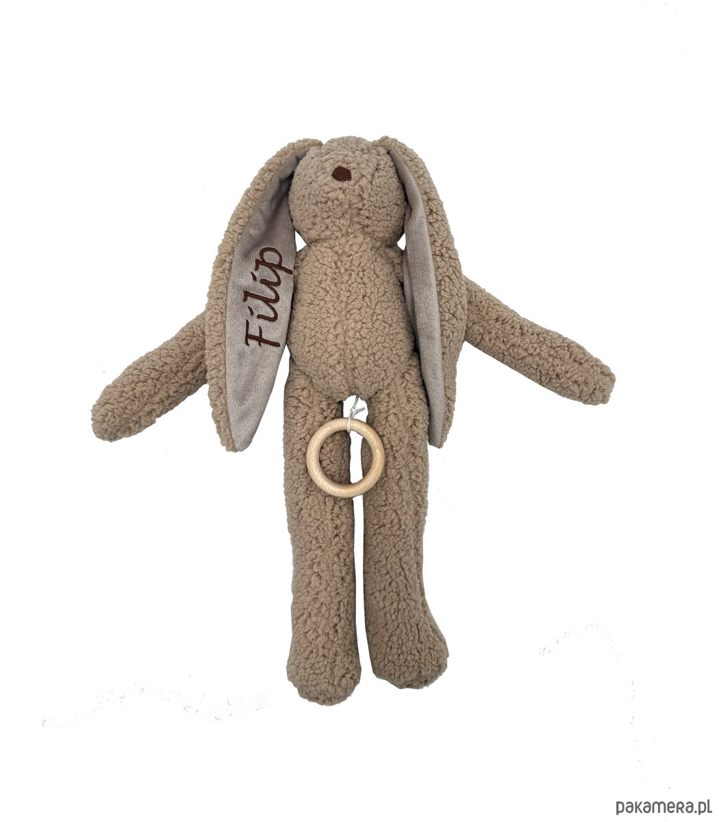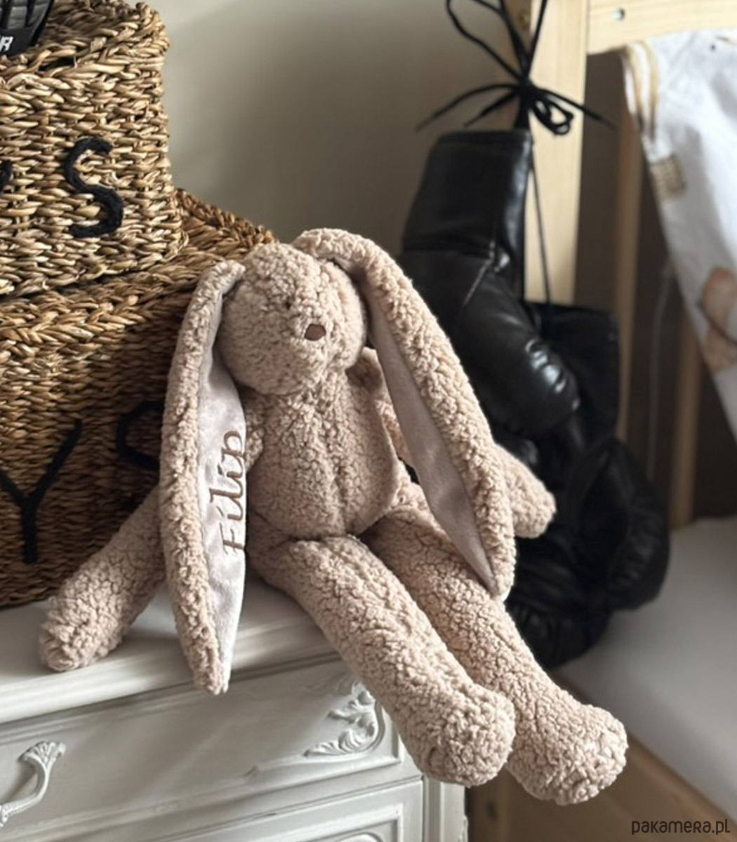 Możliwość personalizacji – wybrania haftu który zostanie umieszczony na uchu królika powoduje, że jest on wspaniałym pomysłem na baby shower, roczek czy chrzciny.