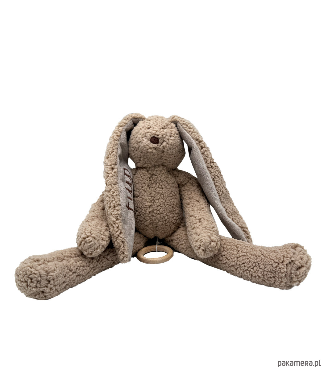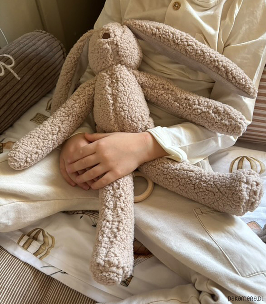 Króliczek ma długie, wąskie nóżki i uszy więc małe rączki z łatwością chwycą ulubionego przyjaciela.
