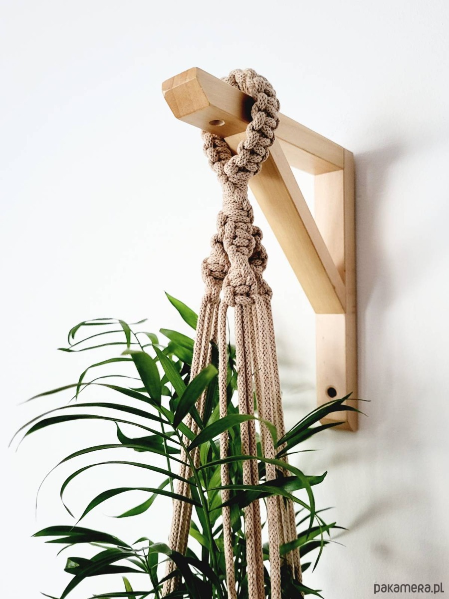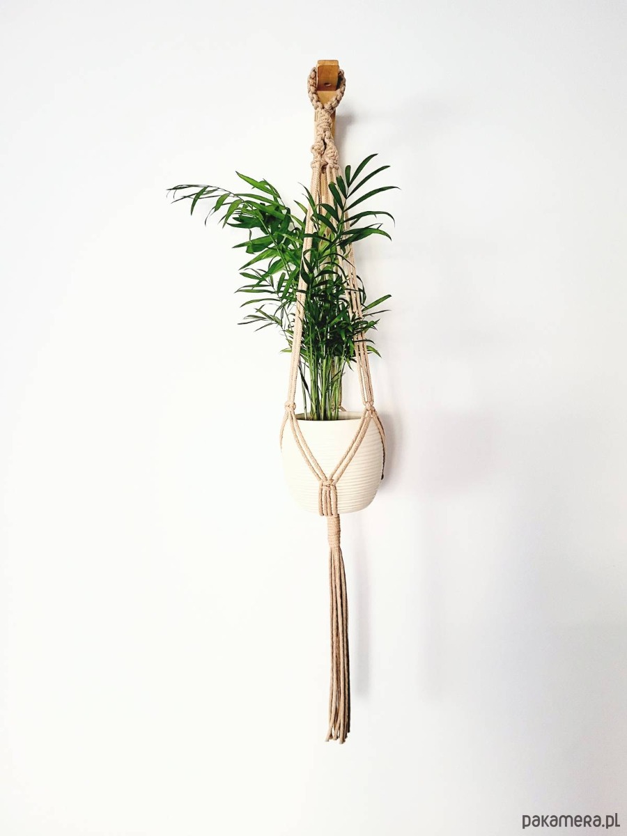 Beżowy kwietnik wiszący, makrama na doniczkę, dekoracja do sypialni
