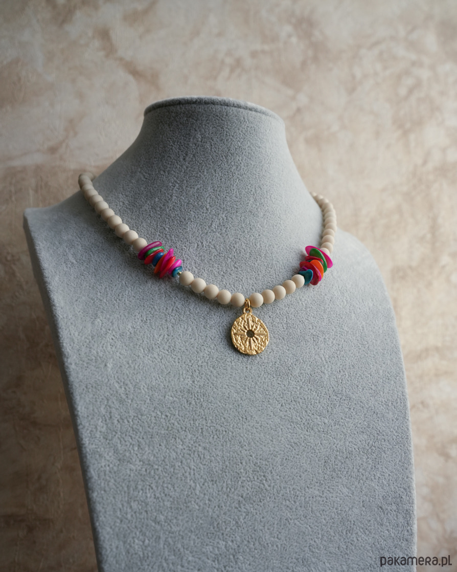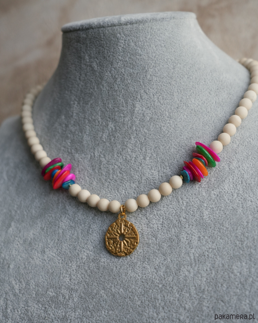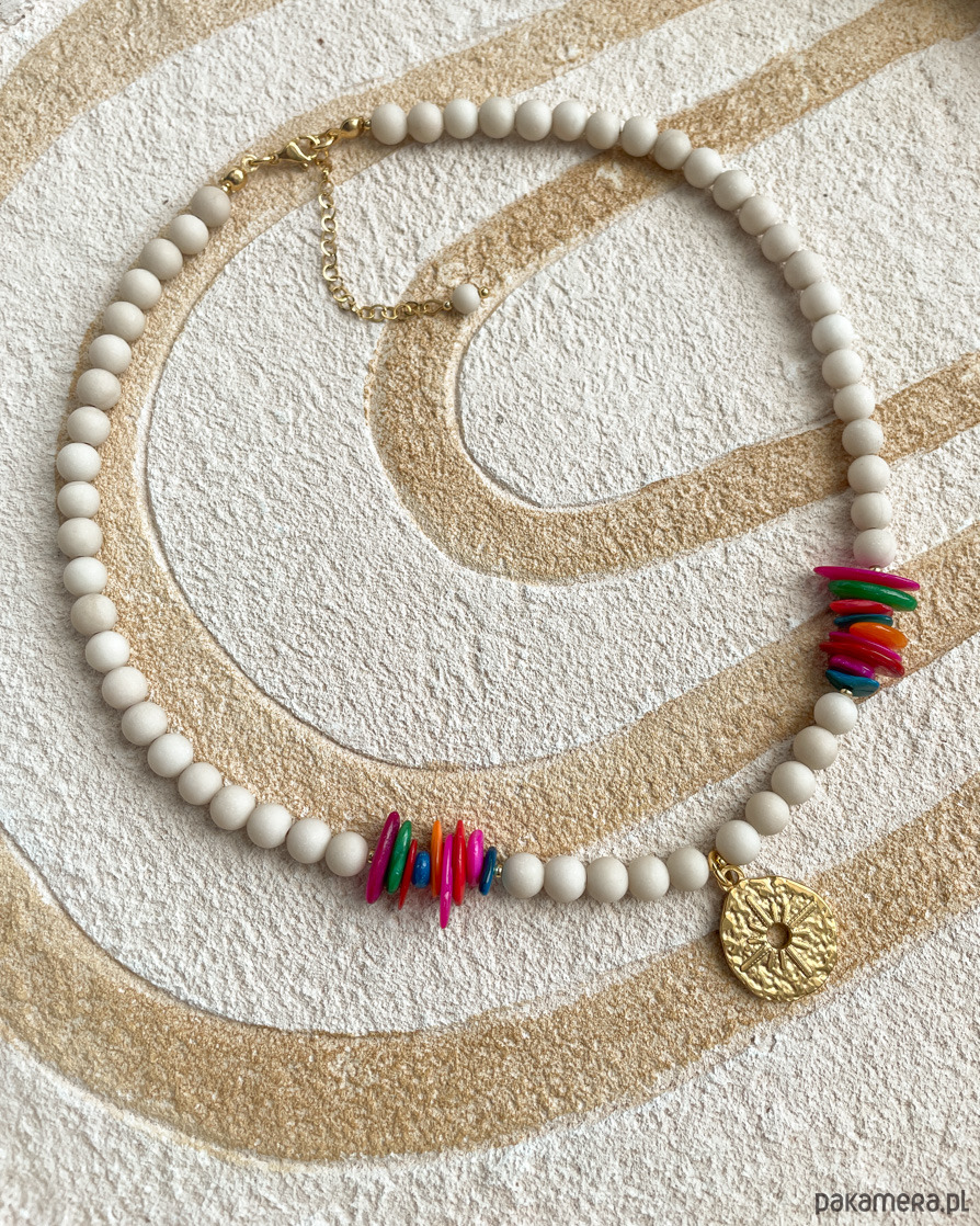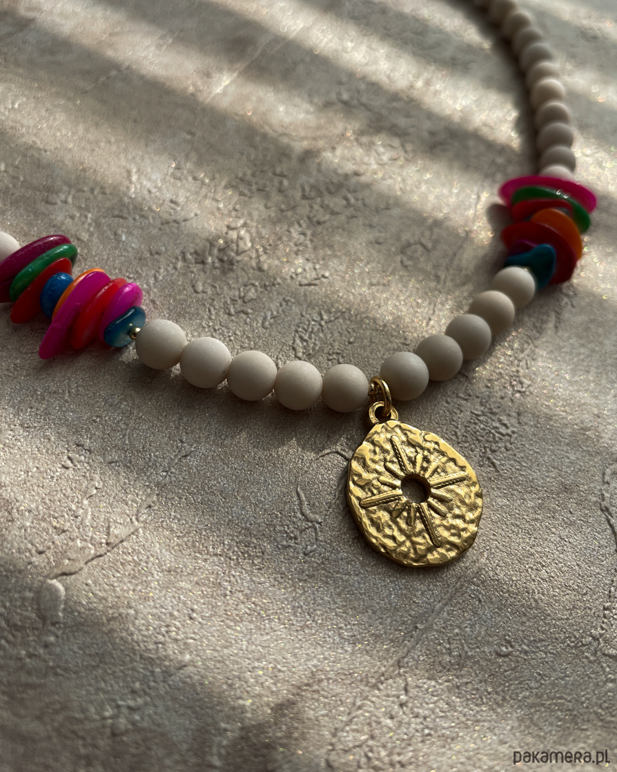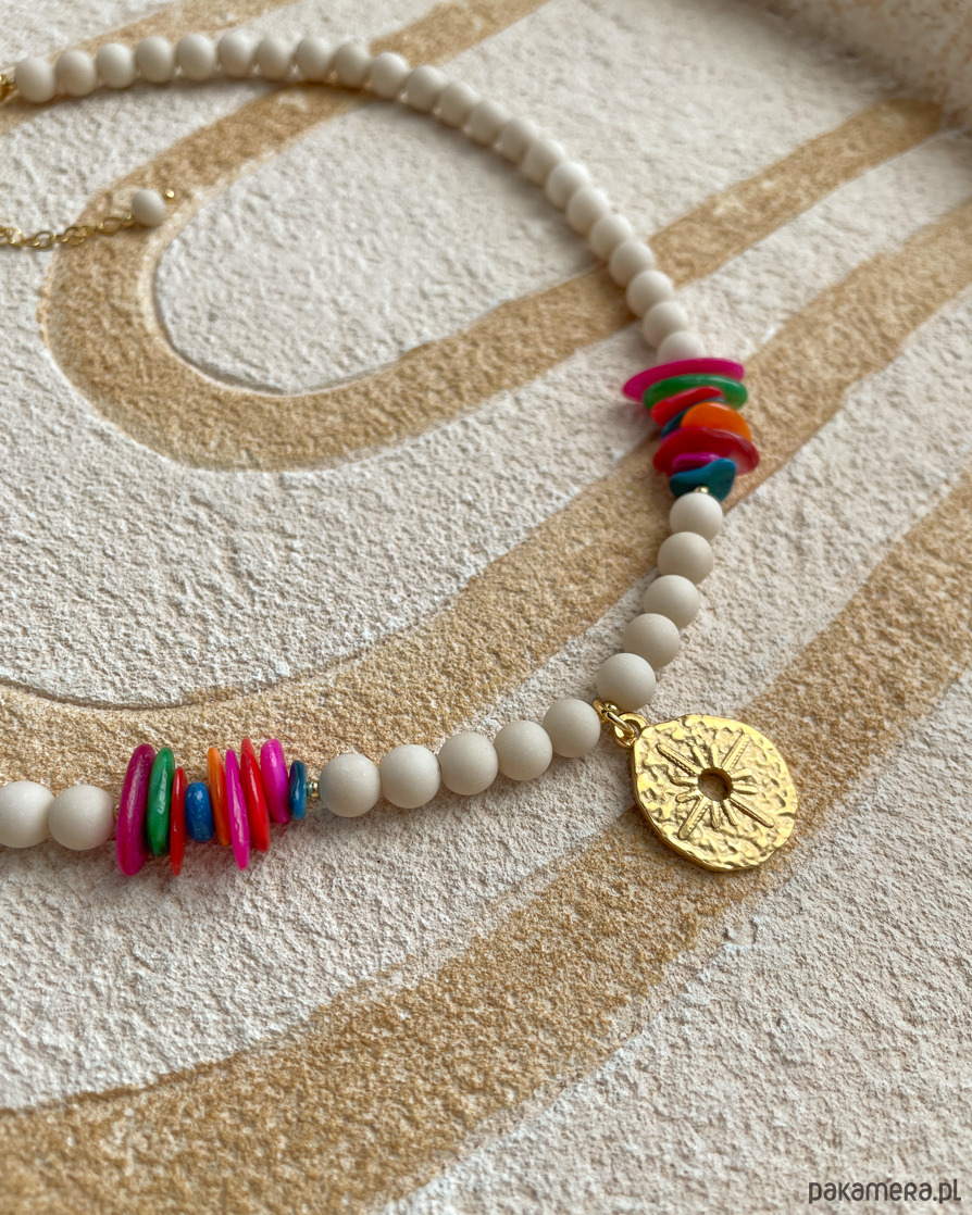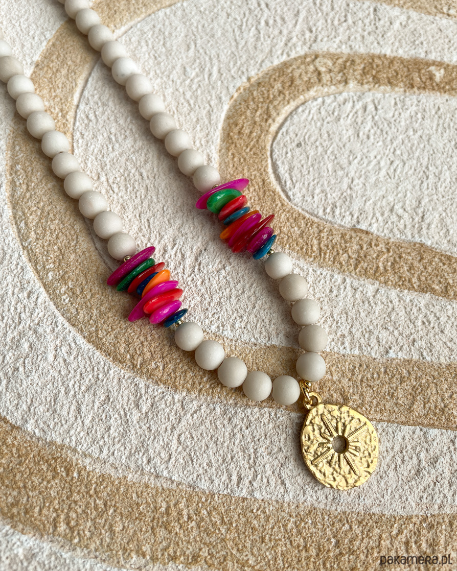 Naszyjnik na lato z beżowego, matowego KAMIENIA RZECZNEGO i kolorowej MASY PERŁOWEJ z zawieszką w kształcie róży wiatrów. Zawieszka, zapięcie i łańcuszek to STAL SZLACHETNA w kolorze złotym.