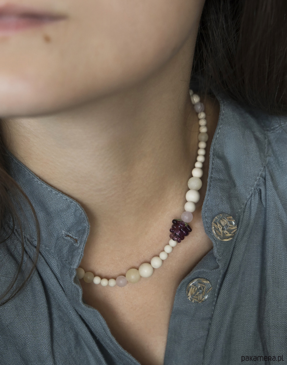 Naszyjnik wykonano z kamieni naturalnych o różnych wielkościach, tworząc efekt „bąbelkowy”. W naszyjniku znalazły się kamienie takie jak: matowy kamień rzeczny, jadeit oraz kwarc różowy. Fioletowa, szklana jeżynka dodaje całości charakteru – to kontrastowy akcent, który przyciąga wzrok i przełamuje pastelową paletę.
