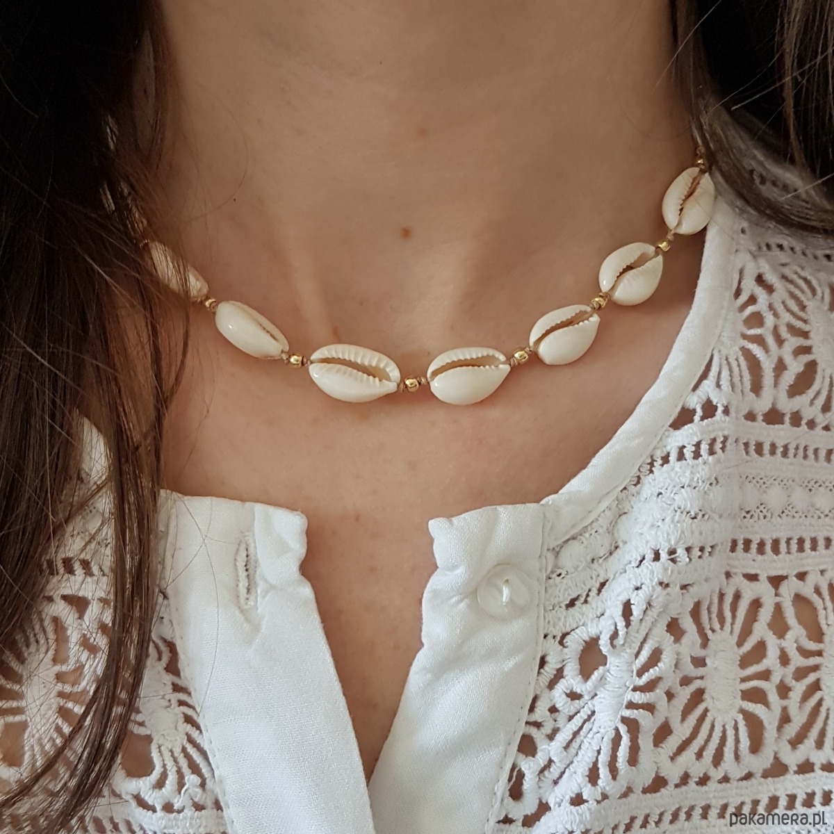 Regulowany naszyjnik wykonany na wytrzymałej nici jubilerskiej z naturalnymi muszelkami kauri w otoczeniu koralików ze szkła japońskiego w kolorze złotym