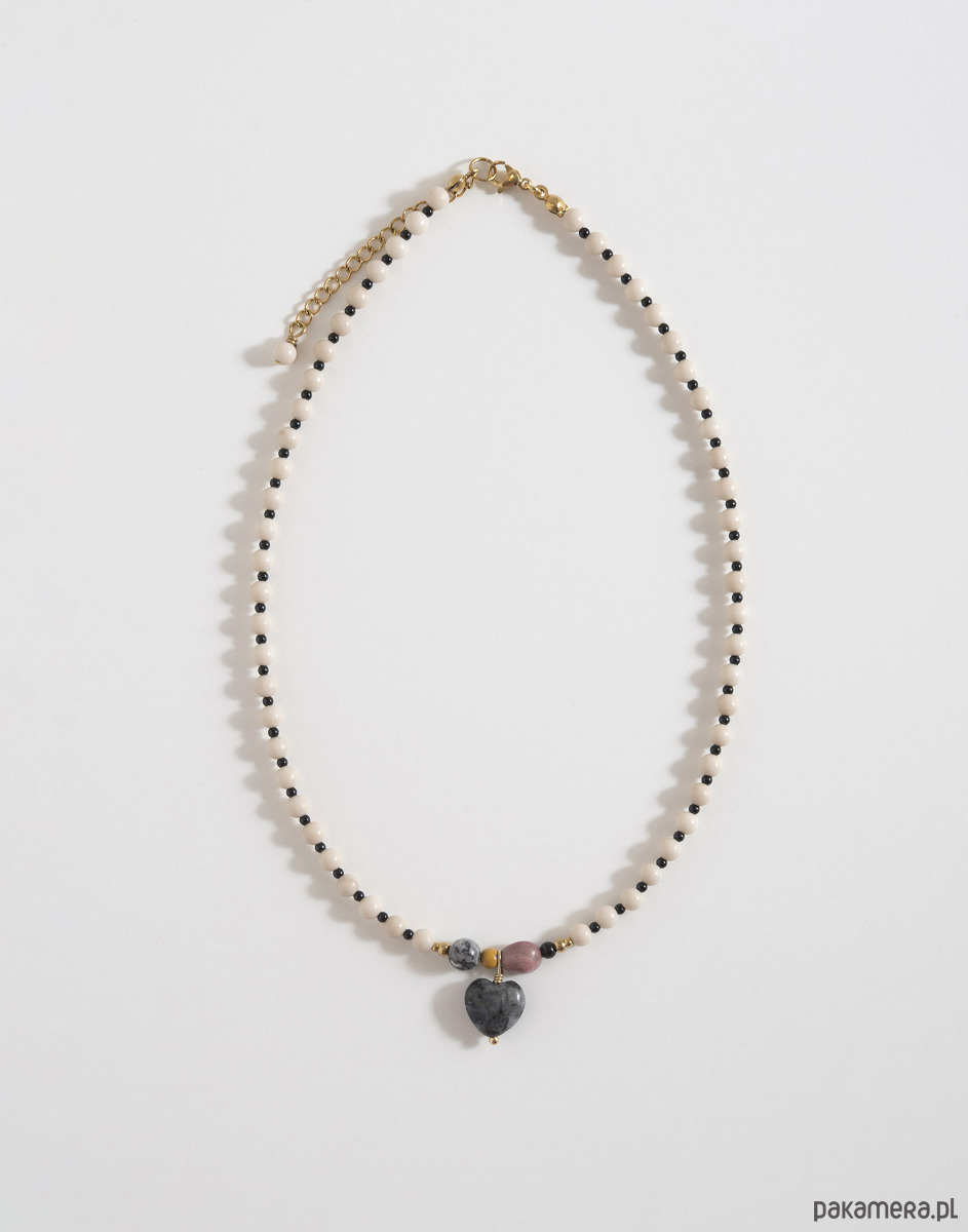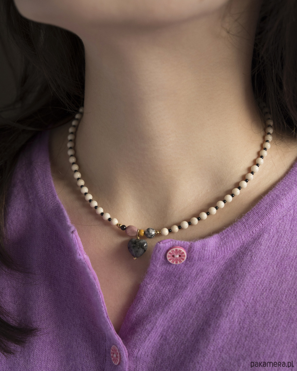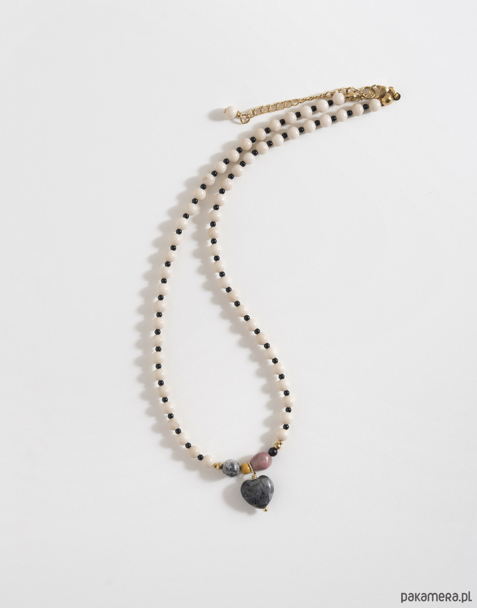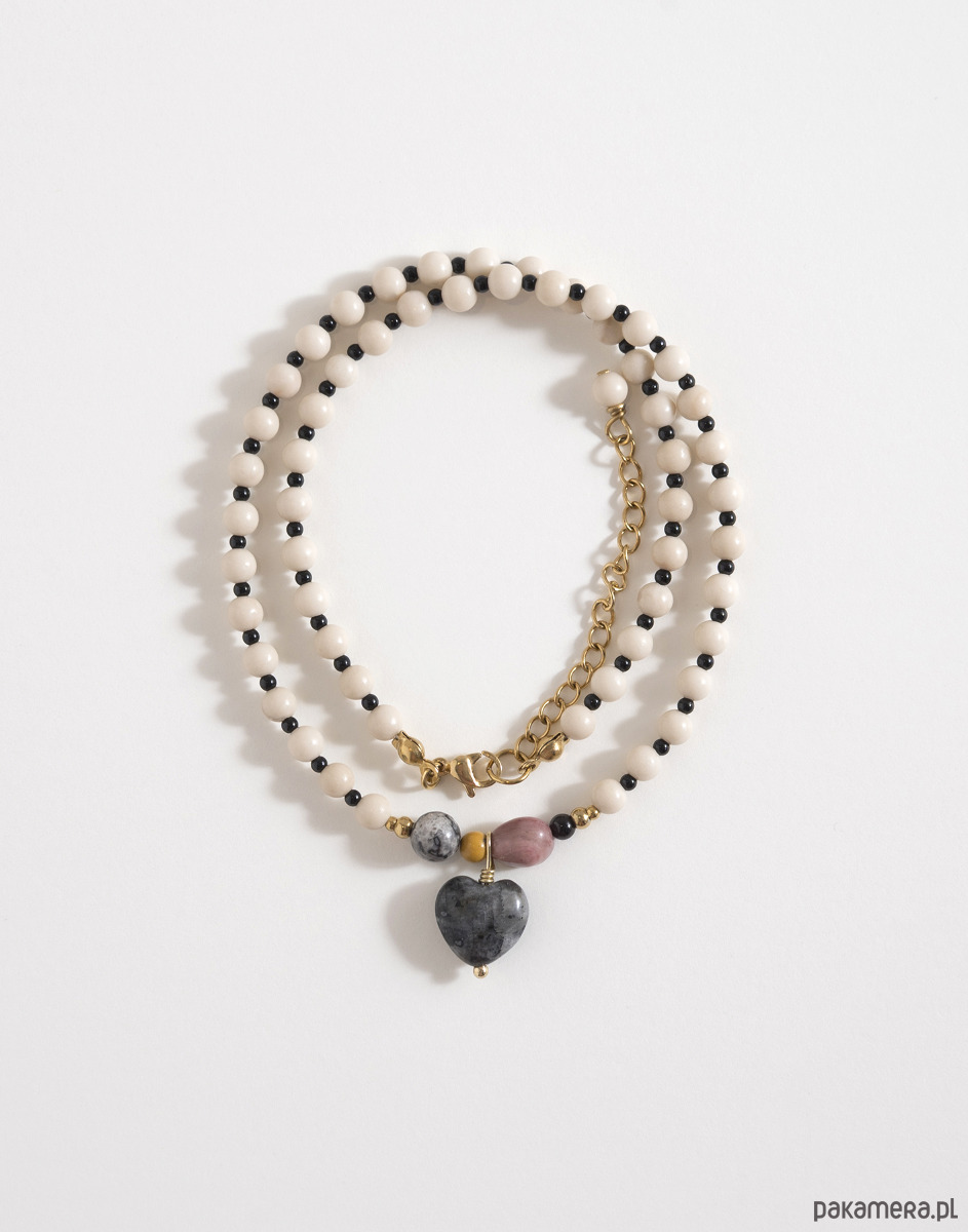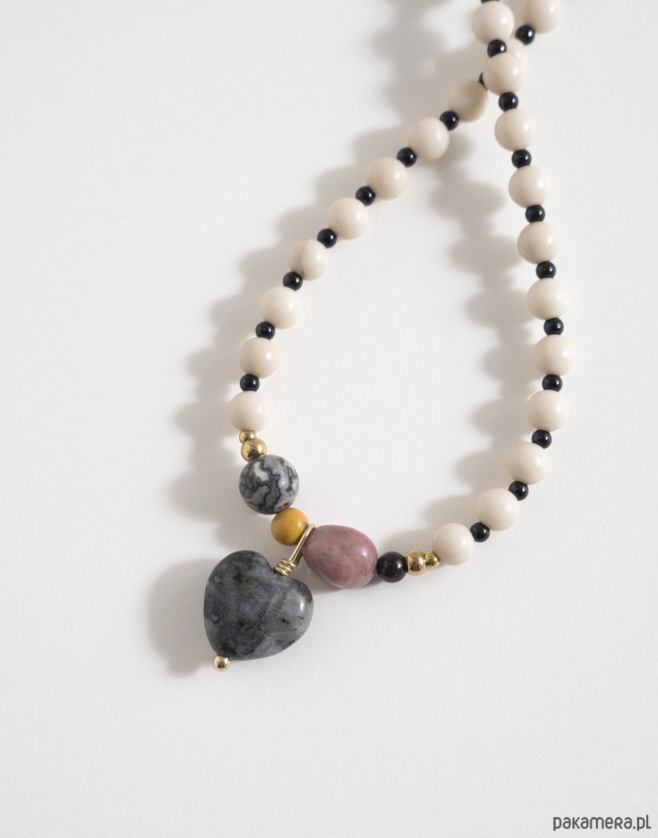 Bazą naszyjnika są kamień rzeczny oraz czarny onyks. W centralnej części znajdują się kamienie o różnych wielkościach: jaspis, granat i rodonit. Całość dopełnia zawieszka w kształcie serca wykonana z naturalnego kamienia.