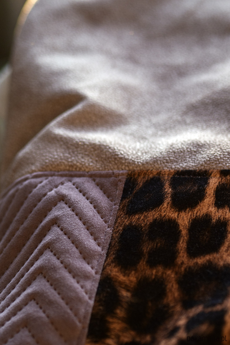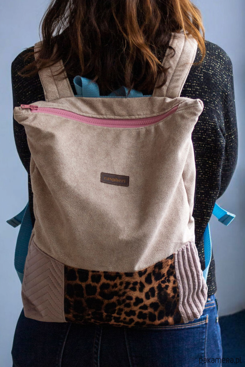 Duży, damski plecak miejski zapinany na suwak z kilku rodzajów kolorowych tkanin w połączeniu z welurem w panterkę.