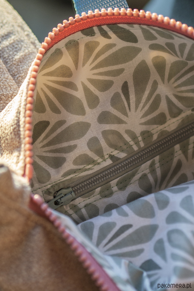 Regulowane paski. W środku wzorzysta, bawełniana podszewka oraz mała kieszonka na suwak.