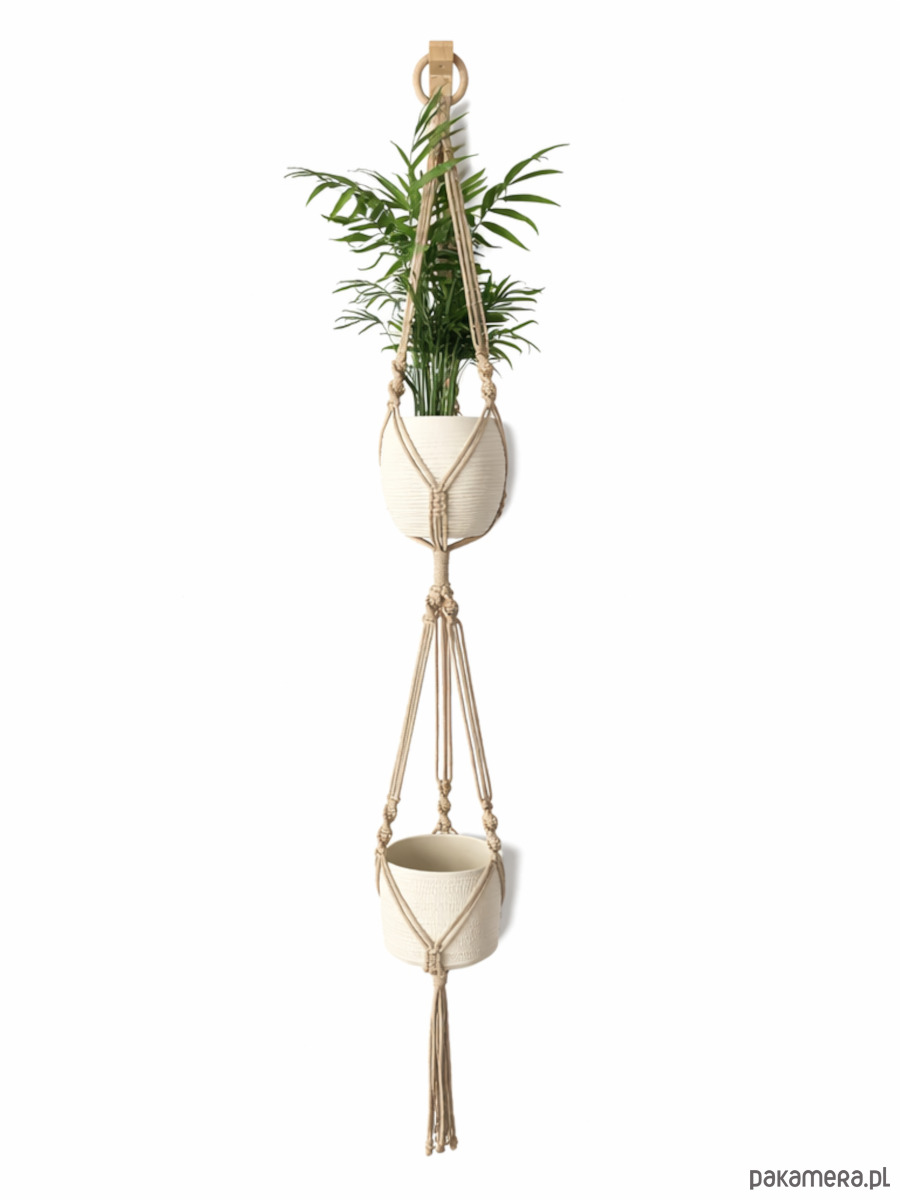 Beżowy podwójny wieszak na doniczki- kwietnik boho makrama