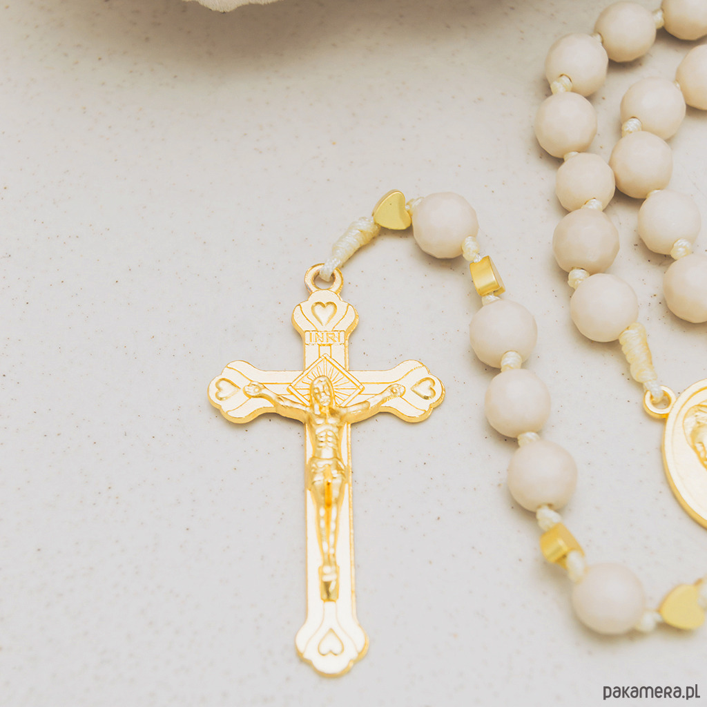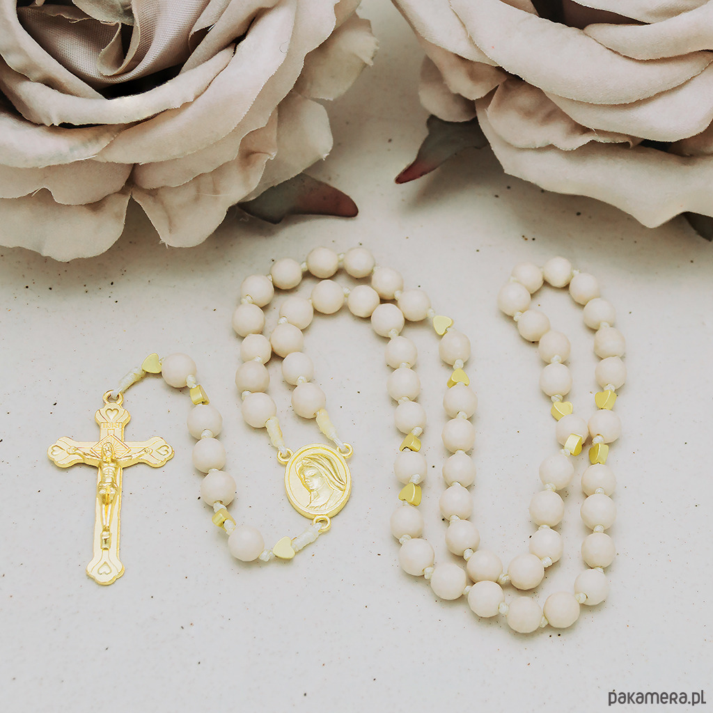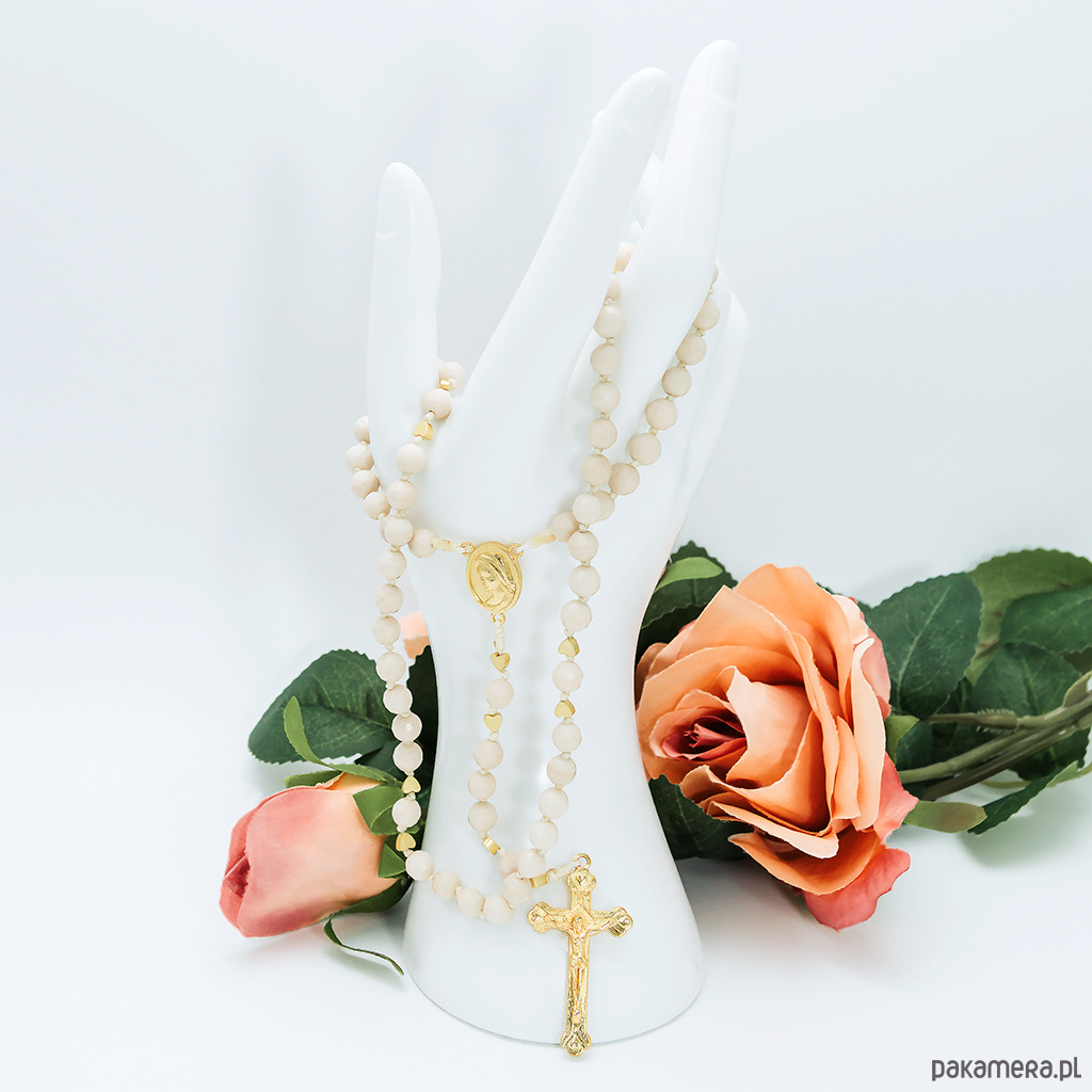Beżowy, ręcznie robiony różaniec KAMIEŃ RZECZNY, I Komunia Św.