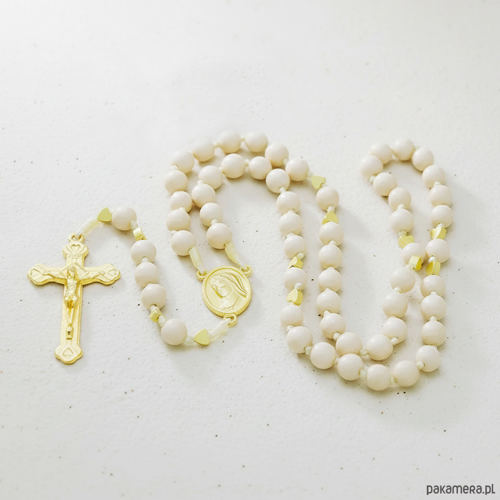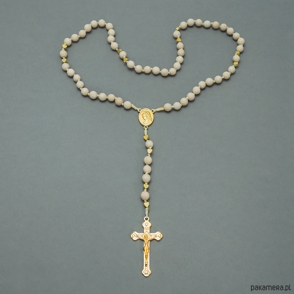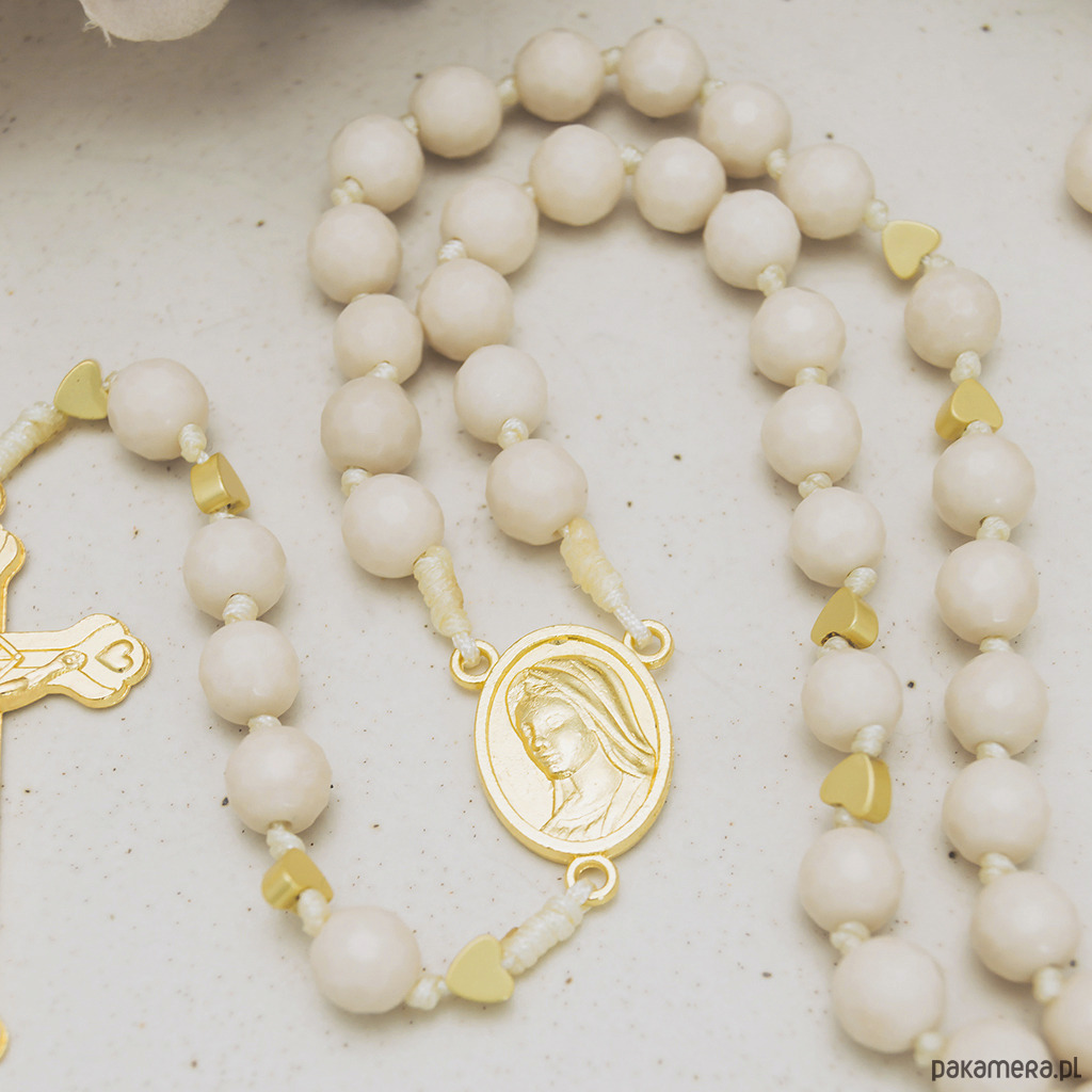Beżowy, ręcznie robiony różaniec KAMIEŃ RZECZNY, I Komunia Św.