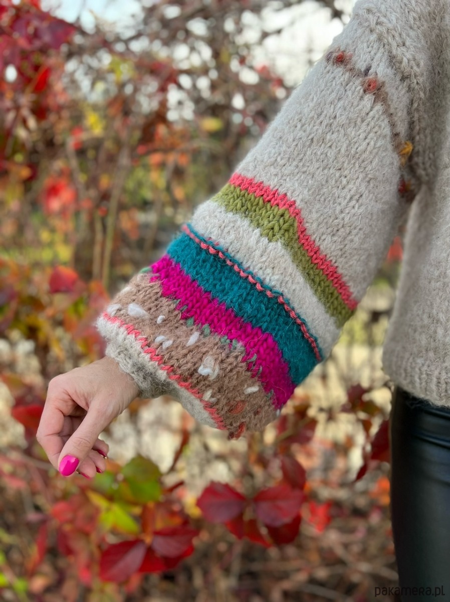 Beżowy sweterek z fantazyjnymi rękawami. Baza to 74% alpaka 25% merino 4%poliamid. Miekki i ciepły