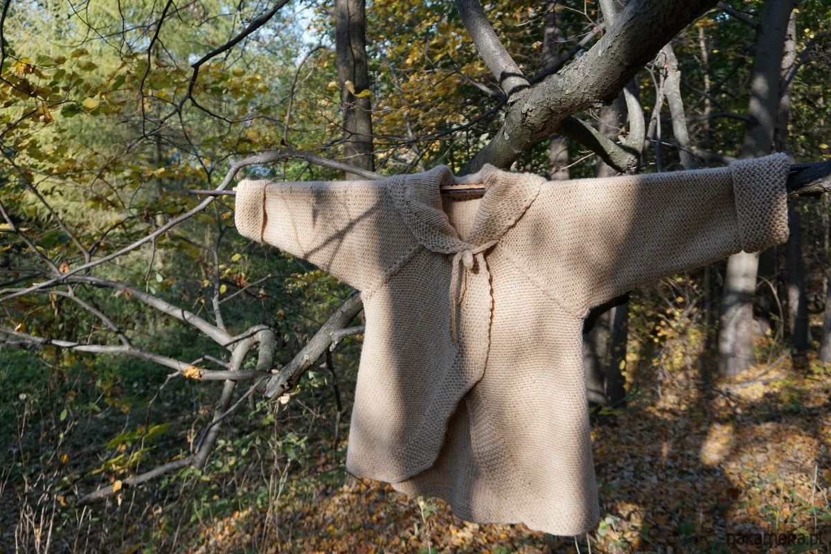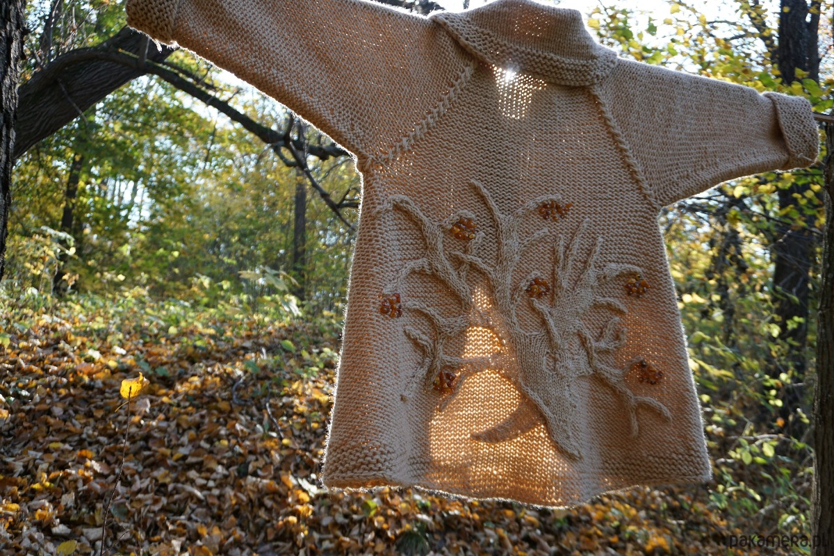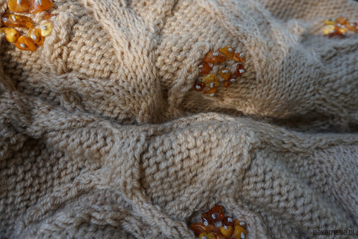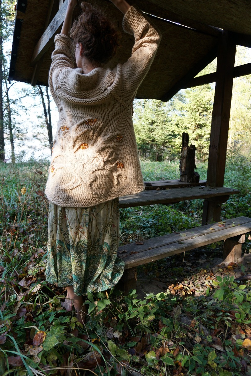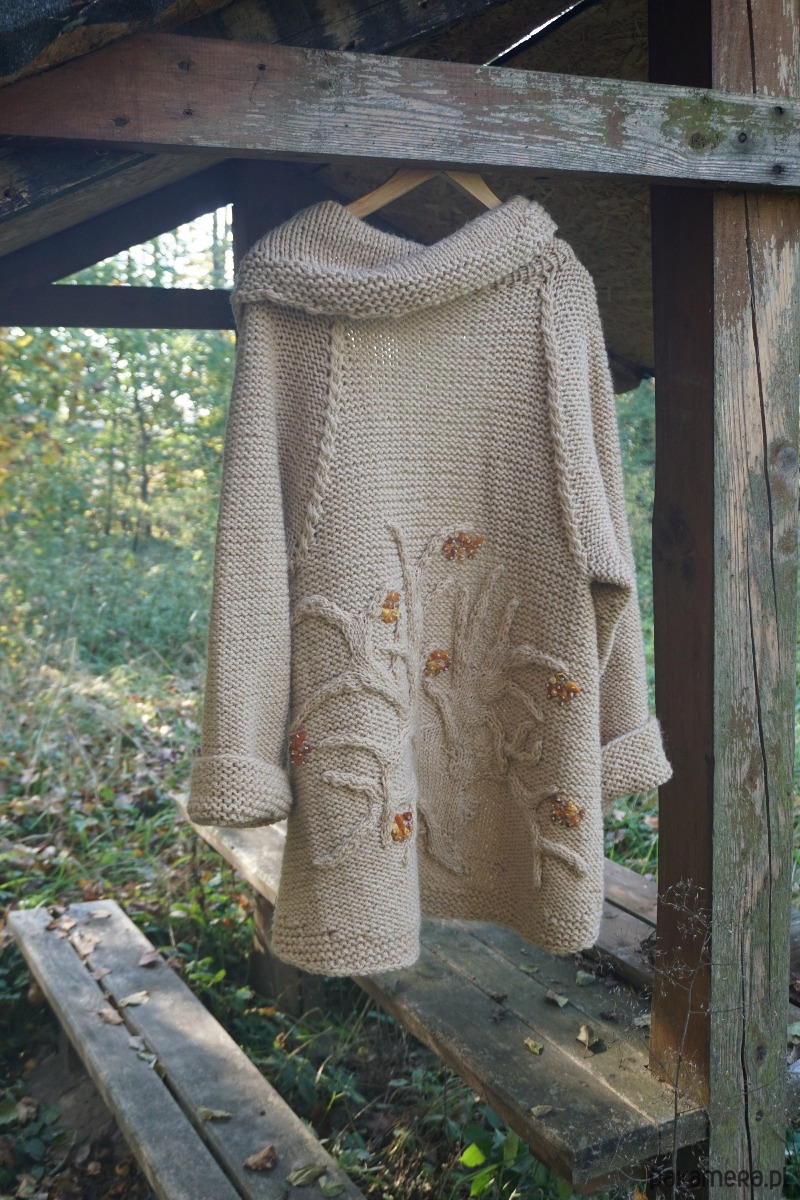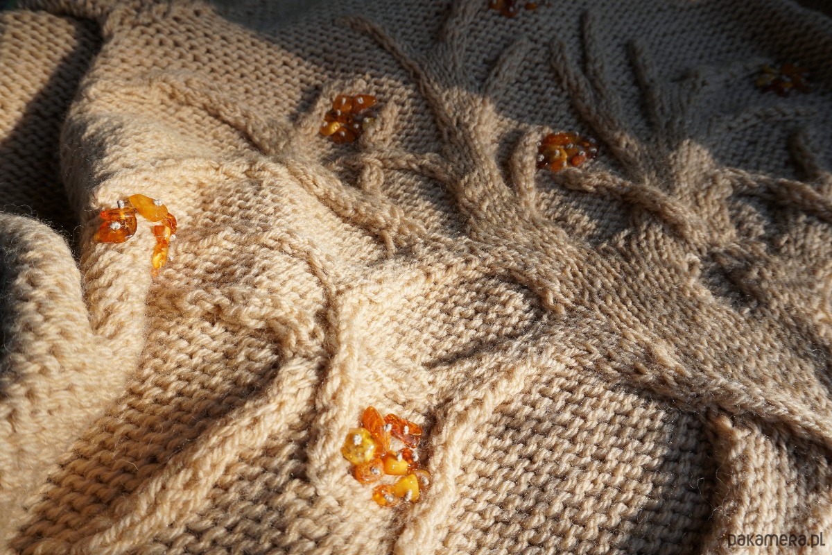 Ten wyjątkowy, oversize’owy sweter–płaszcz został wykonany ręcznie z grubej, miękkiej przędzy w naturalnym, piaskowo-beżowym odcieniu. Na plecach znajduje się efektowny motyw drzewa, którego liście zostały stworzone z prawdziwego bursztynu. Każdy detal powstał ręcznie, czyniąc ten projekt unikatowym dziełem do noszenia.