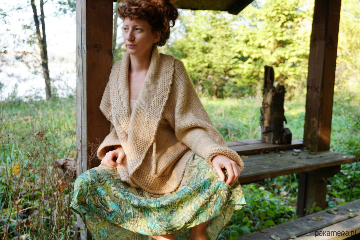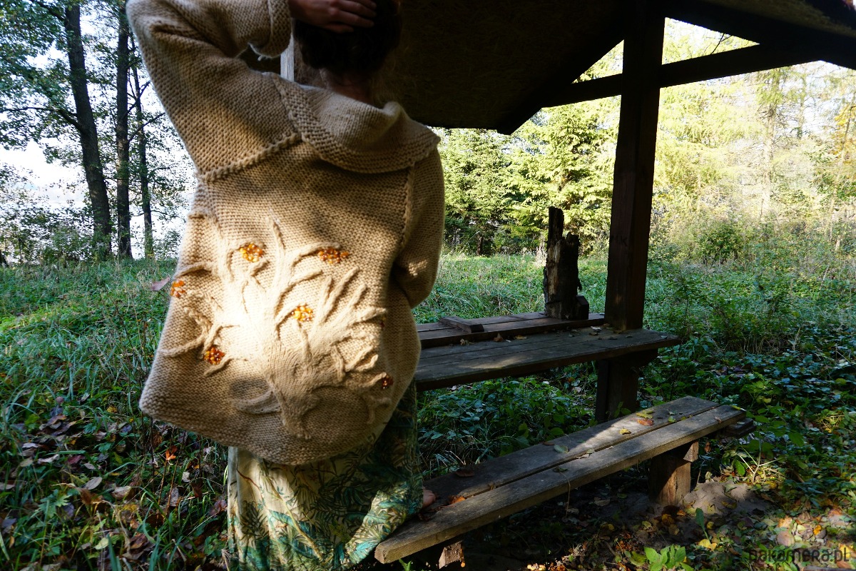 Beżowy wełniany sweter - płaszcz z bursztynowym drzewem, oversize