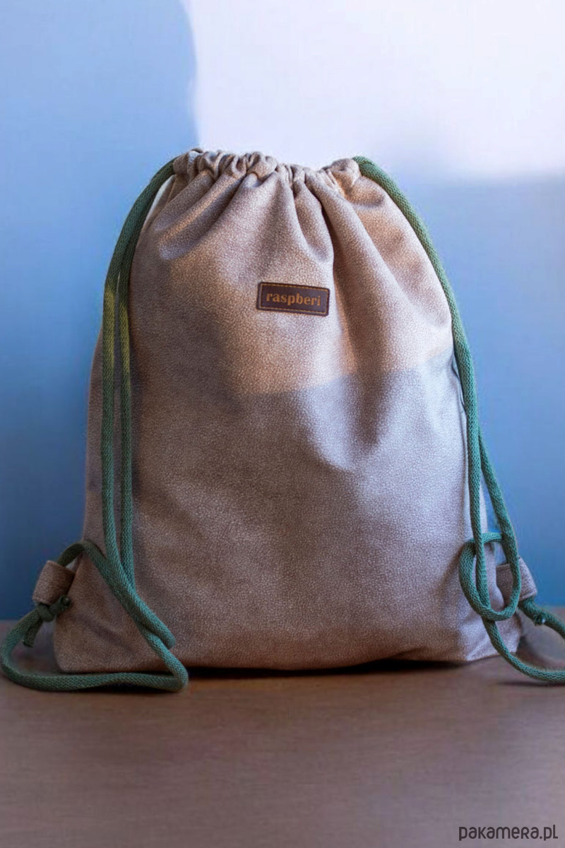Plecak worek w kolorze beżowym wykonany z weluru.