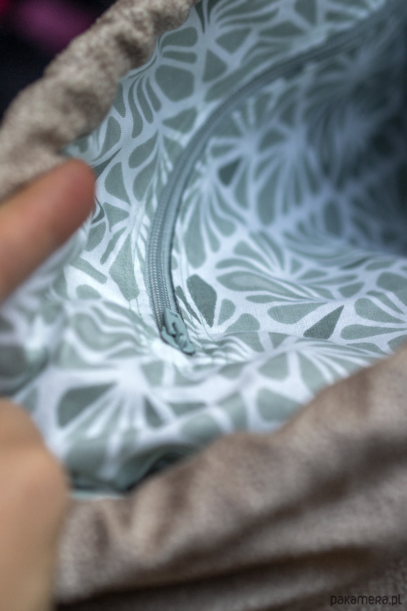 Wzorzysta bawełniana podszewka. Kieszonka w środku.