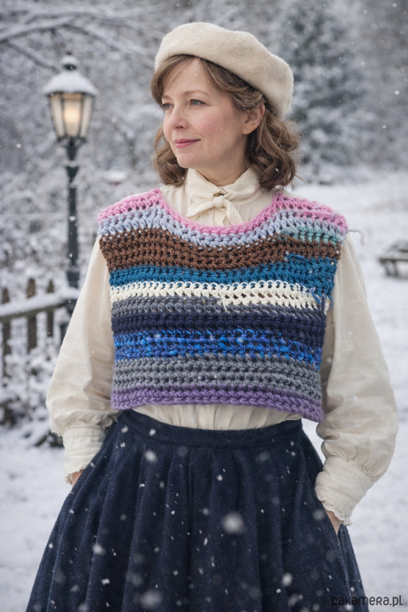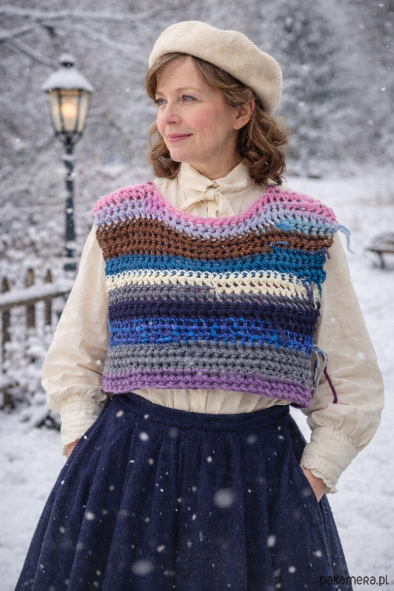 Unikatowy Bezrękawnik wykonana w całości ręcznie na szydełku z 100% naturalnej wełny. Każdy egzemplarz to niepowtarzalne połączenie kolorów – z obu stron bezrękawnik prezentuje się inaczej, co nadaje wyjątkowy, artystyczny charakter.