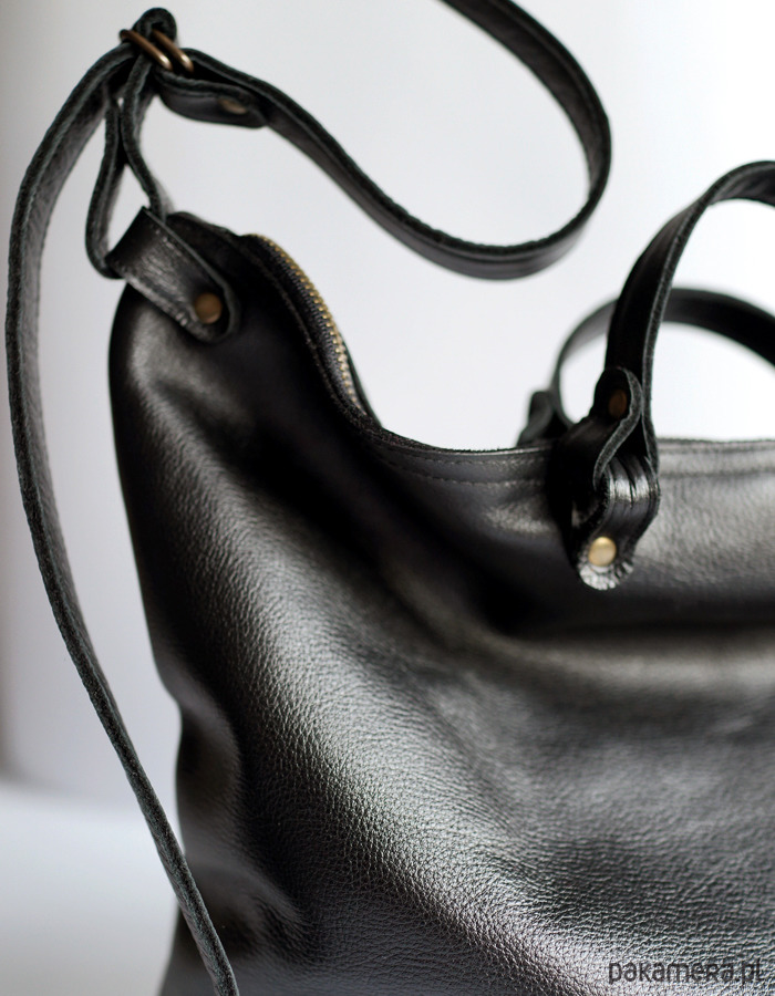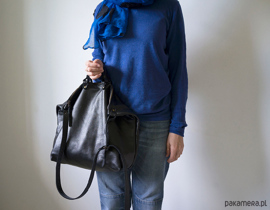 Duża minimalistyczna torba z czarnej skóry. Pomieści wszystkie kobiece rzeczy. Multifunkcjonalna, na ramię, przez ramię i do ręki. Oryginalne uchwyty. W środku podszewka z jedną dużą kieszenią i małą kieszonką na telefon. Wykonana z wysoko gatunkowej licowej, czarnej skóry. Zapinana na zamek. Zmieści bez problemu format A4.