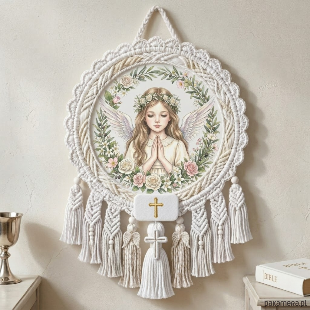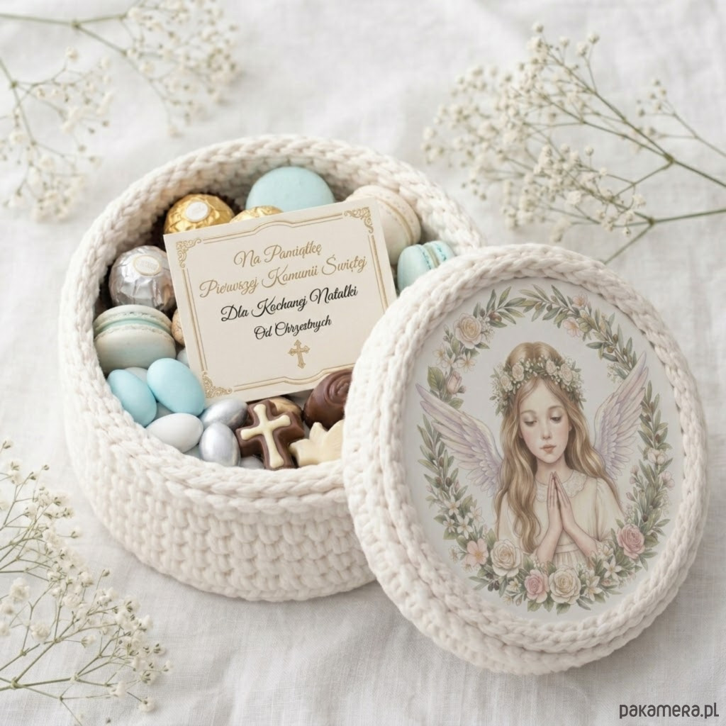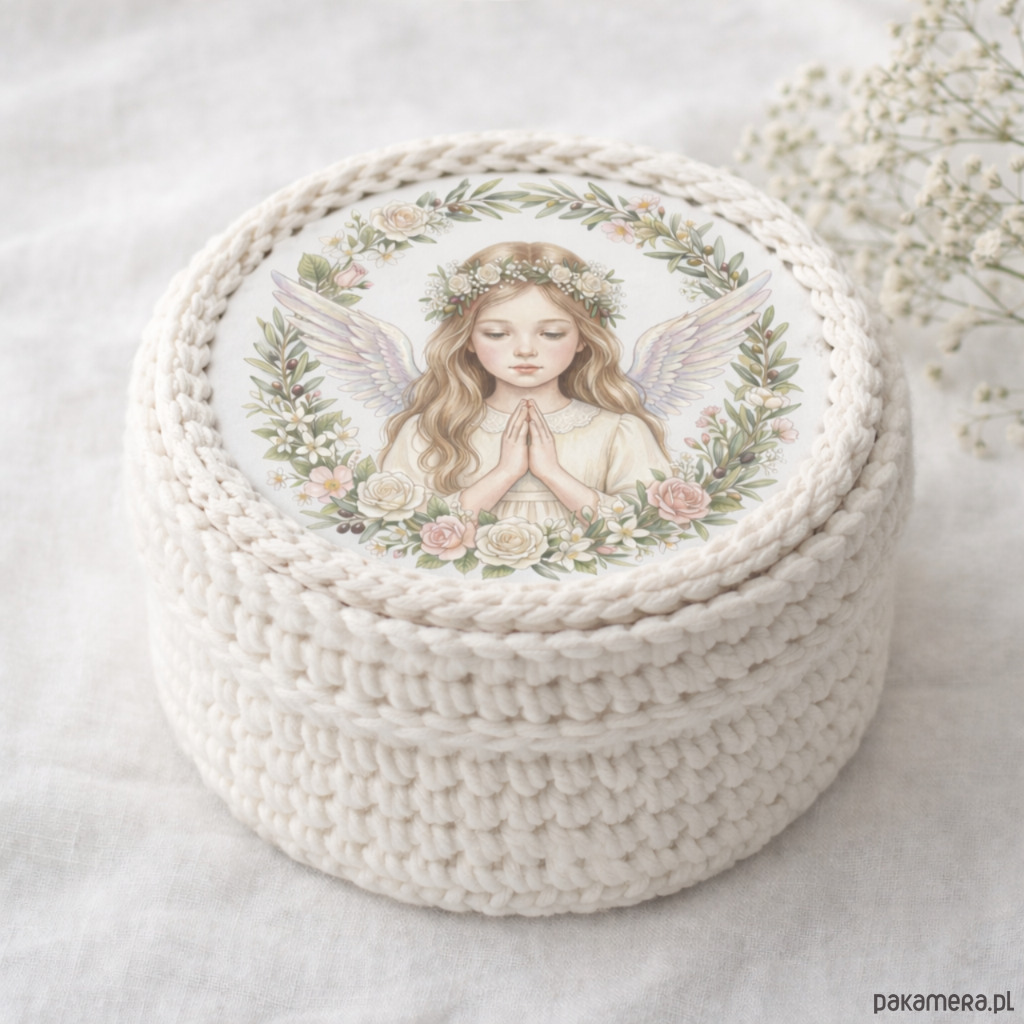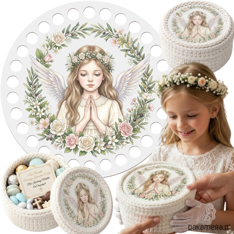 Elegancka drewniana baza do szydełkowania o średnicy 15 cm w białym kolorze z kolorowym nadrukiem UV to idealna podstawa do tworzenia wyjątkowych koszyczków i dekoracji komunijnych. Subtelny, dziewczęcy design sprawia, że produkt doskonale wpisuje się w klimat Pierwszej Komunii Świętej.