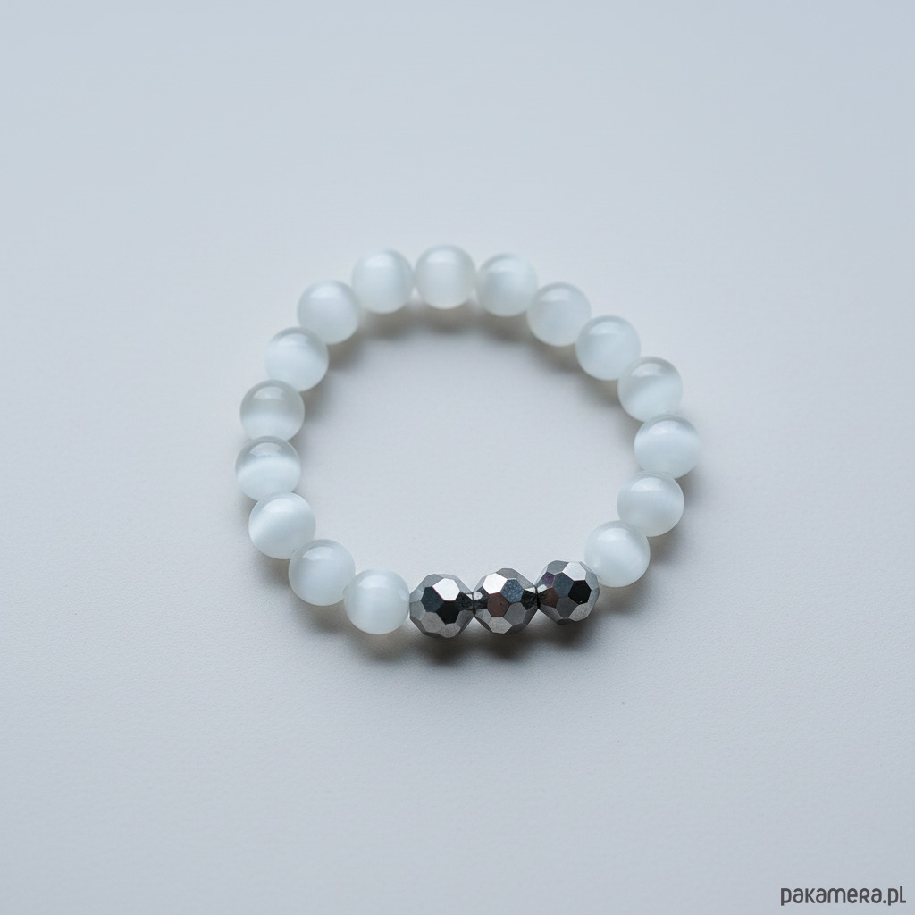 Ta biała bransoletka to połączenie klasyki i nowoczesności. Wykonana z koralków szklanych ‘kocie oko’, które słyną z niepowtarzalnego efektu głębi i blasku, oraz srebrnych kryształków szklanych, które dodają całości subtelnego szlifu.