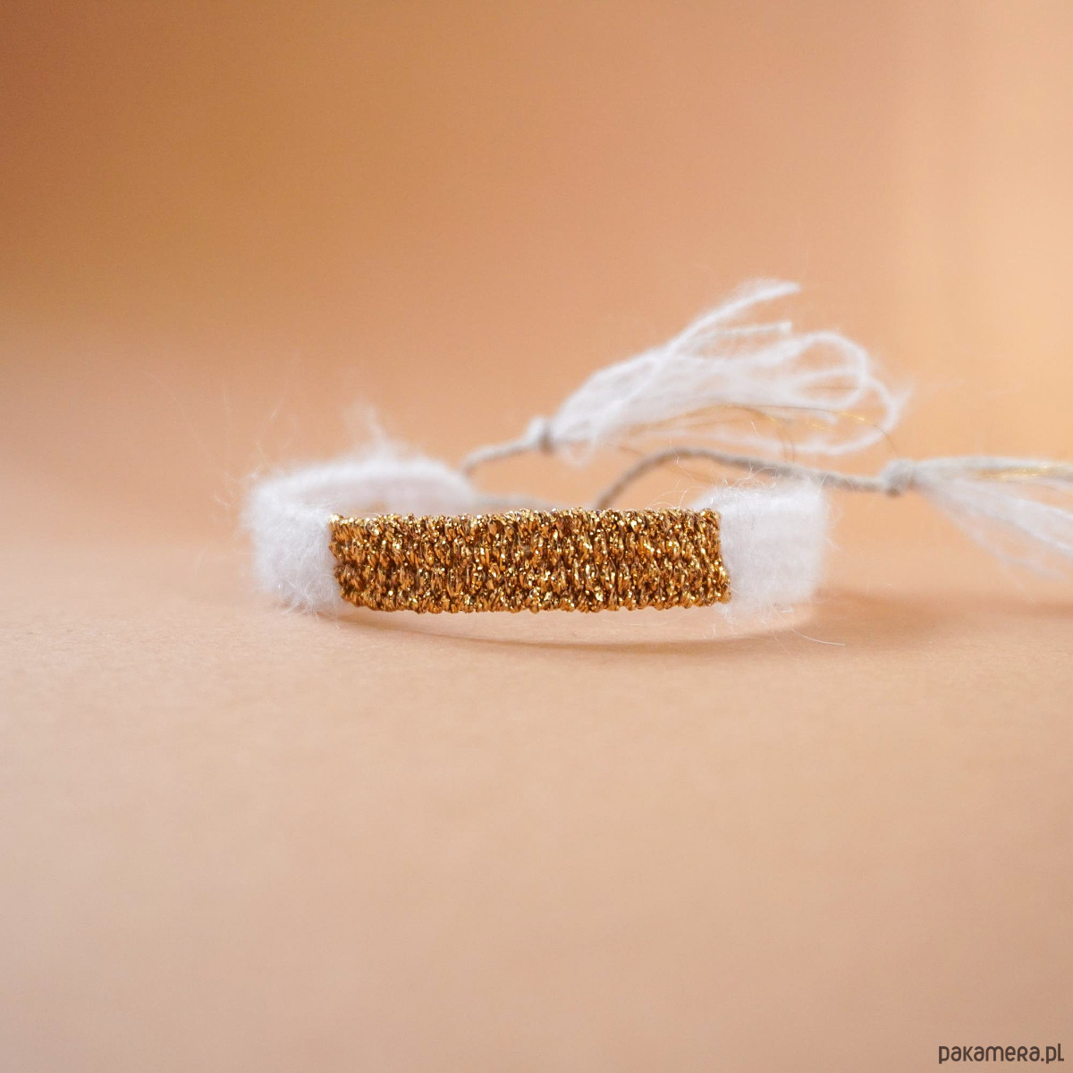 Piękna, biała bransoletka wykonana ręcznie na krośnie. Bransoletka jest zrobiona z puszytej mieszanki z moherem, na środku mamy błyszczący odcinek ze złotej nici metalizowanej a z boku haft z koralikami dodatkowo efektowne chwosty. Cudowna biżuteria na każdą okazję. Idealny pomysł również na prezent :).