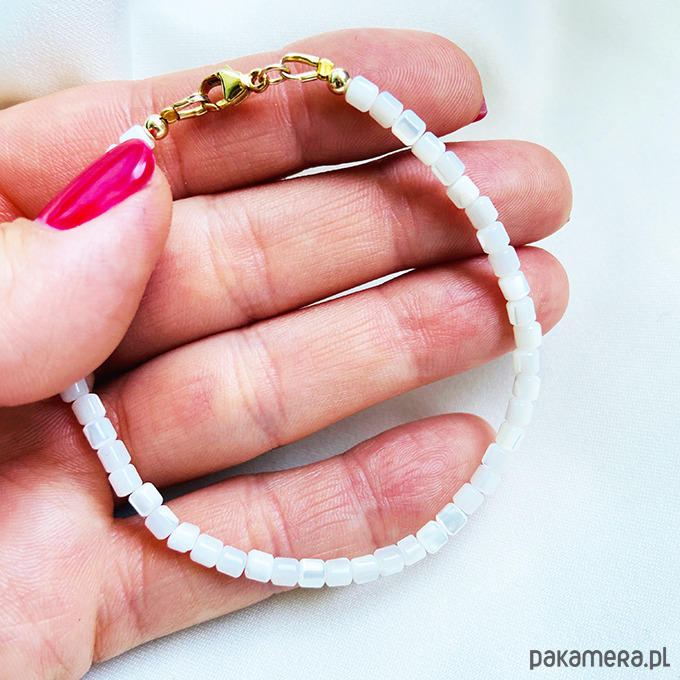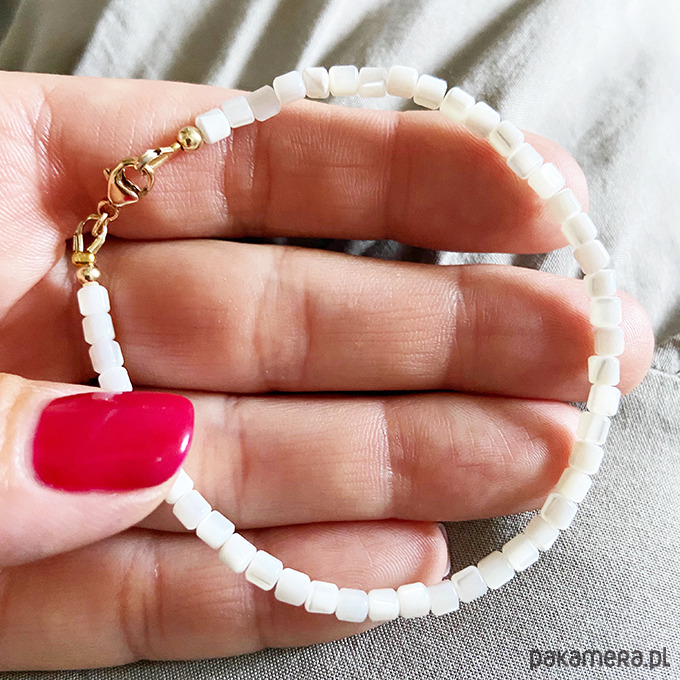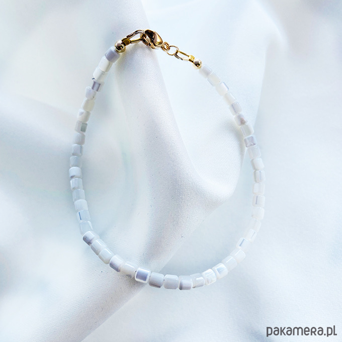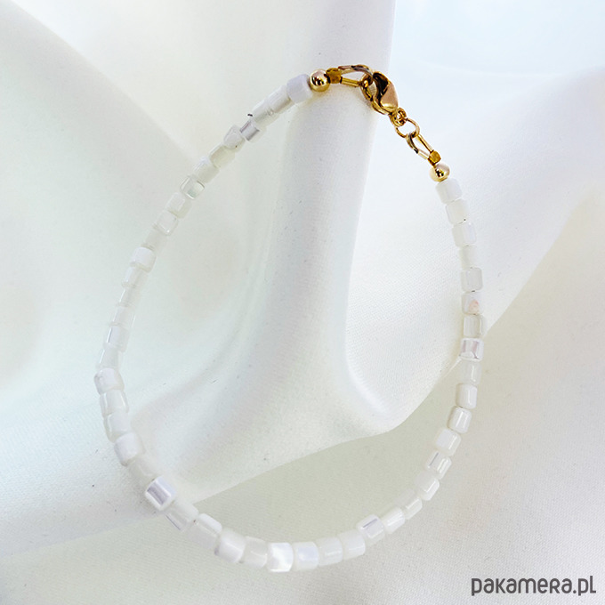 Elegancka bransoletka z delikatnych koralików z masy perłowej, bardzo efektowna . Wykonane ręcznie z kamieni i srebrnych złoconych 24 k złotem elementów.