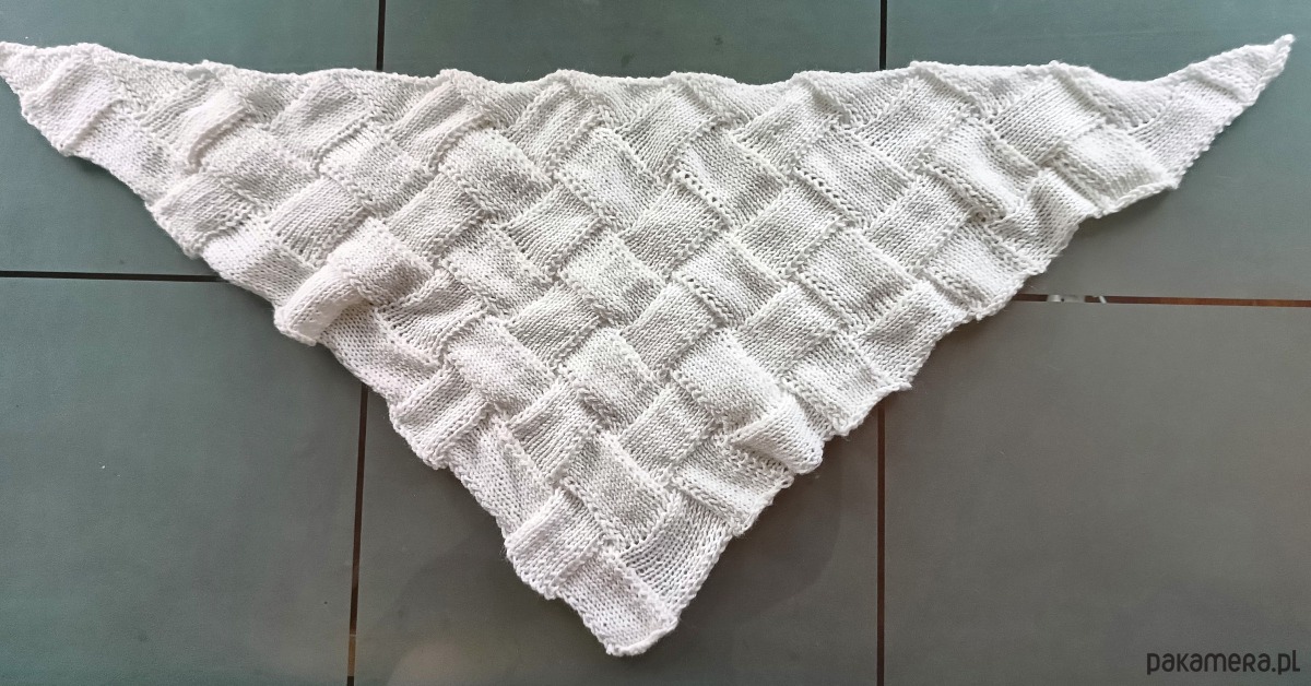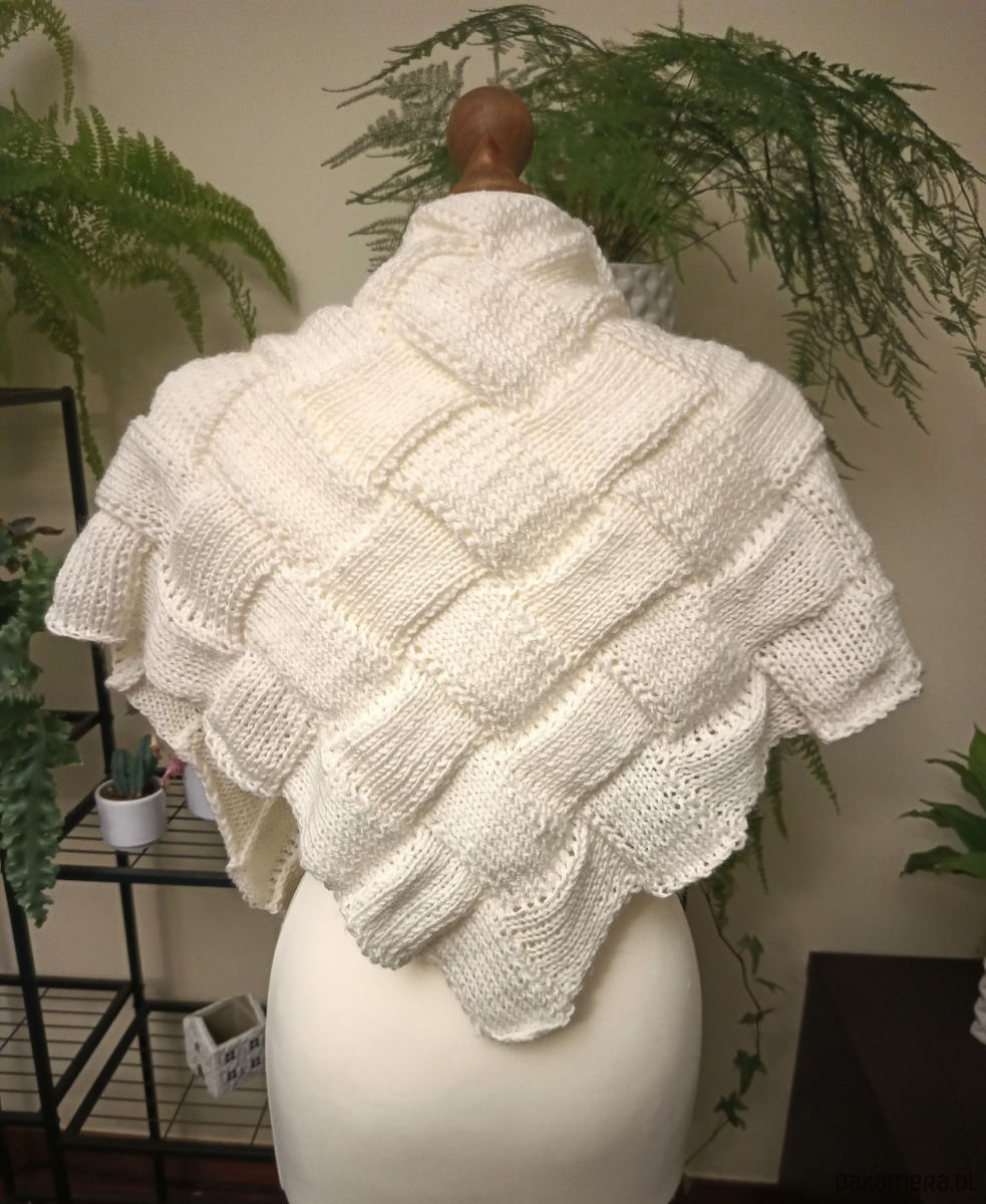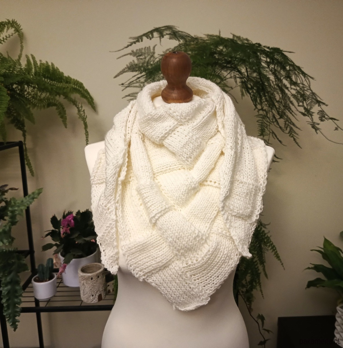 Chusta ma kształt trójkąta. Wykonałam ją ciekawym wzorem przypominającym plecionkę. Chusta Bandama stanowi świetny dodatek do każdej stylizacji. Można ją nosić na wiele sposobów, jako chustę na ramiona, na szyję lub chustę na głowę zastępującą czapkę.