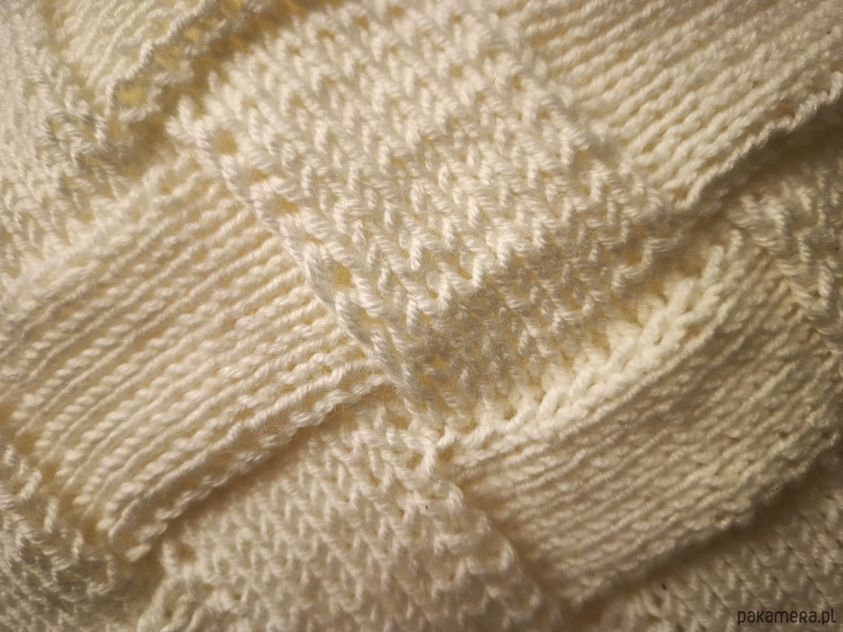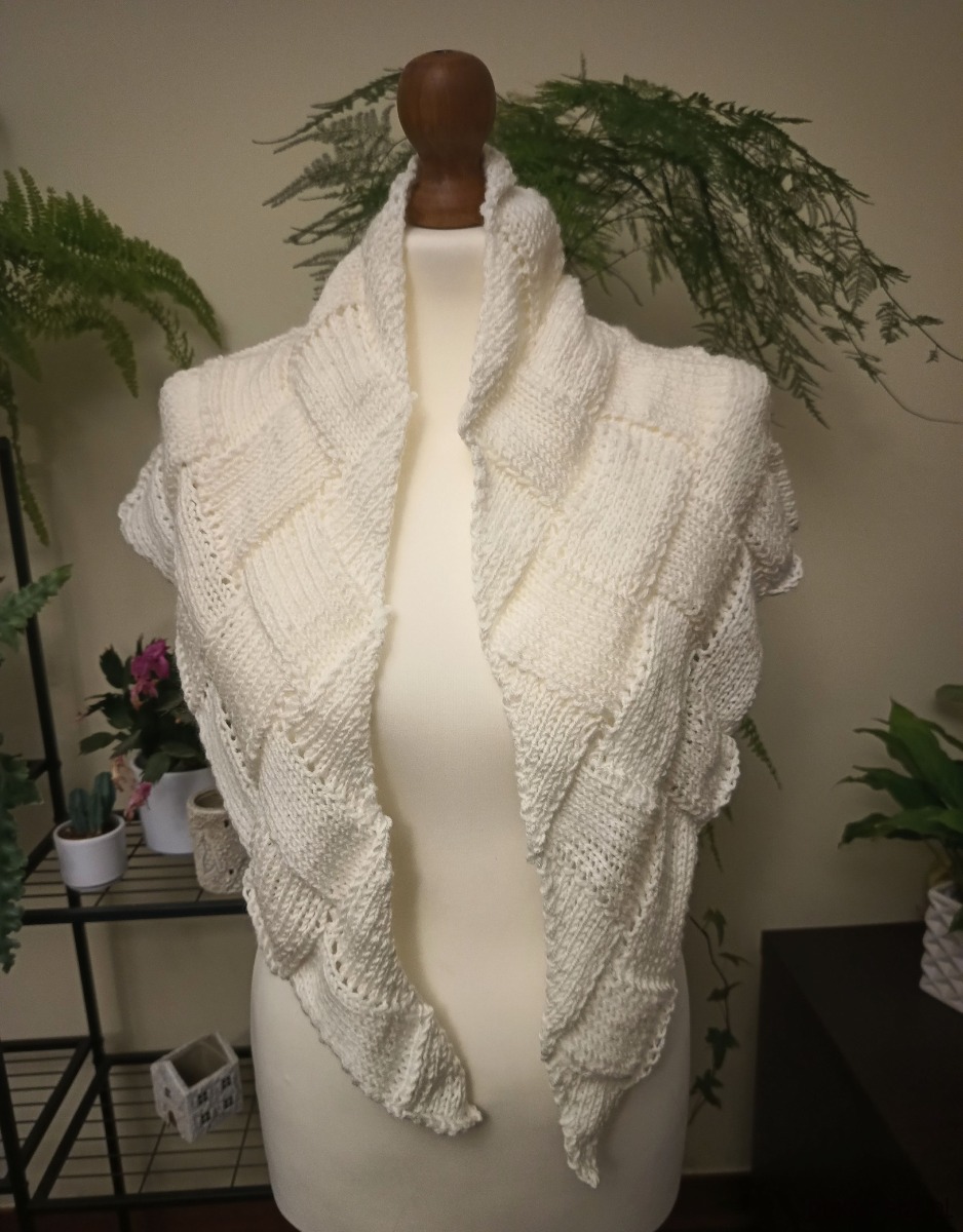 Chustę wydziergałam ręcznie z delikatnej dzianiny. Włóczka jest miękka i niegryząca.