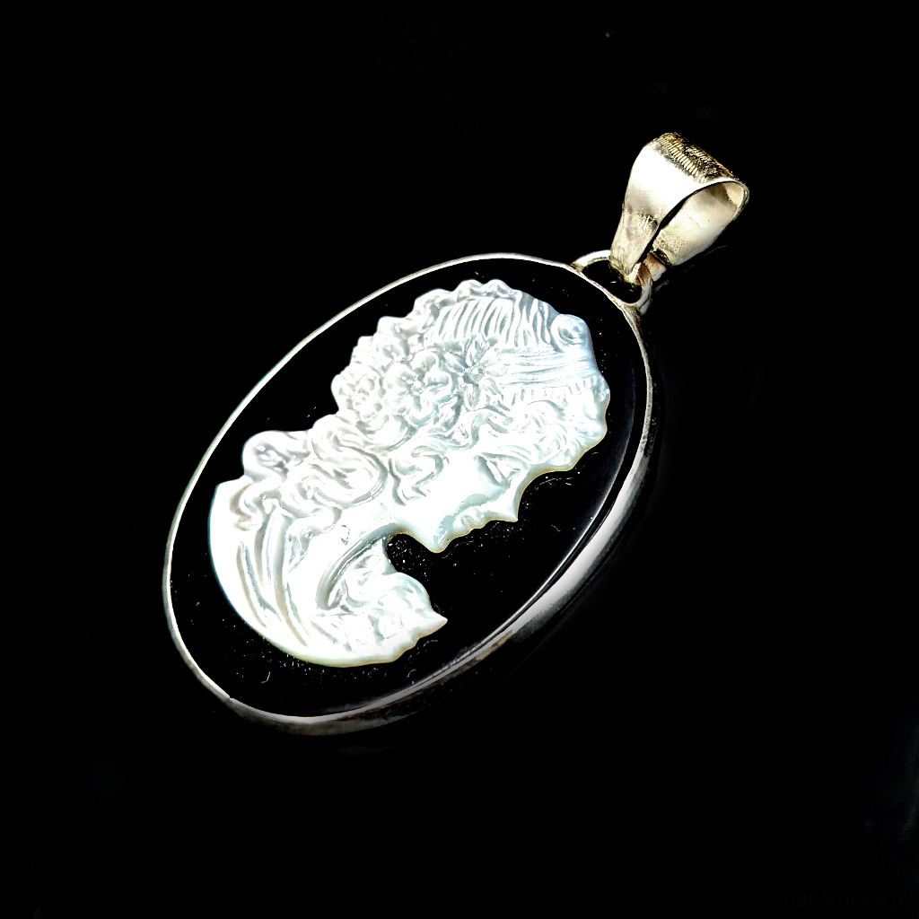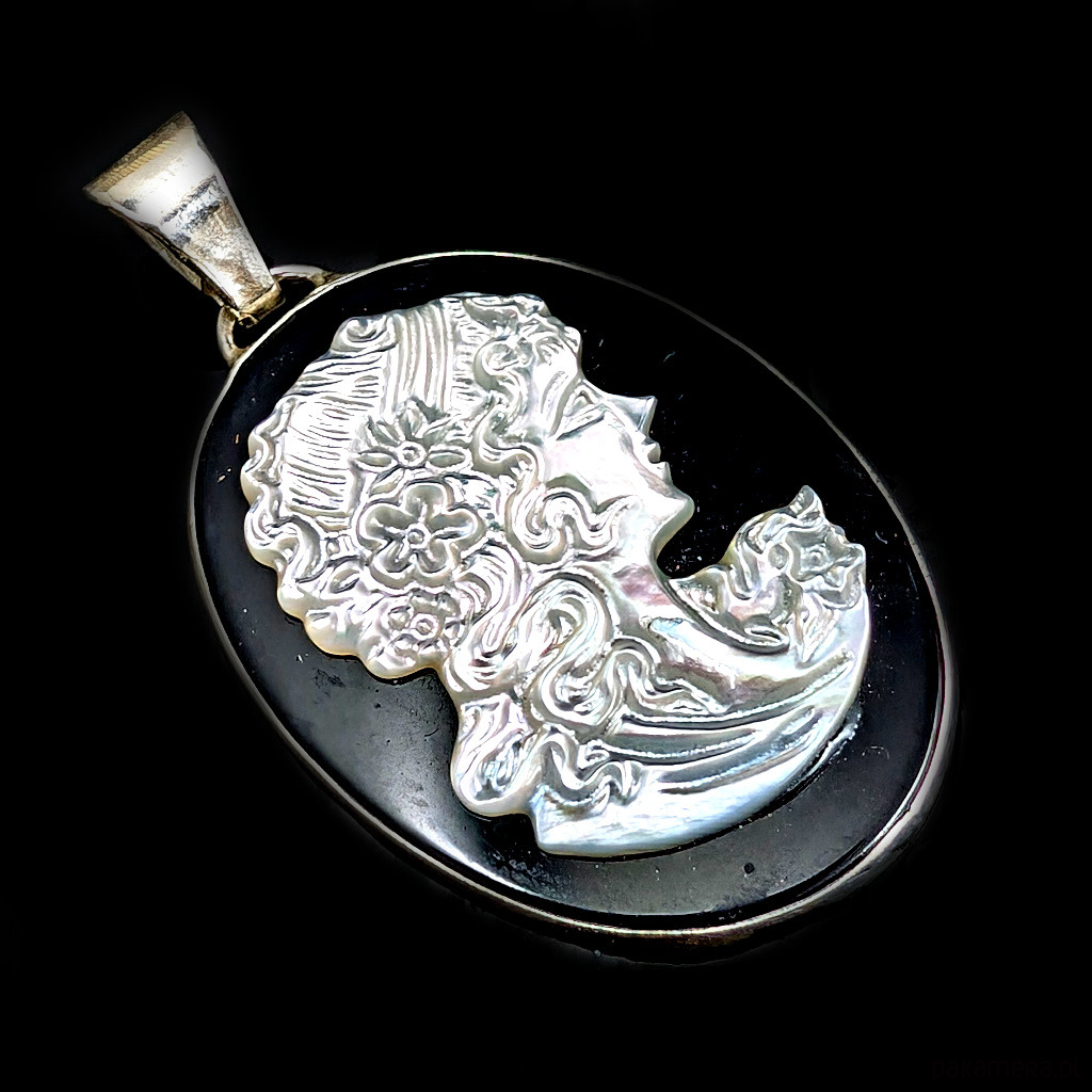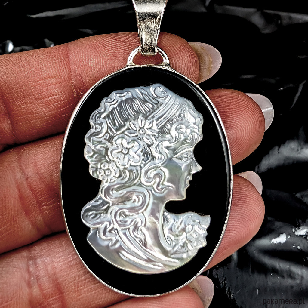 Romantyczny wisiorek wykonany ze srebra próby 925. W centrum zakomponowana jest piękna kamea z frezowanej muszli na podstawie z onyksu. Wymiary oprawy 40 x 31 mm. Długość max 53 mm. Waga 9,3 g. Zostanie zapakowany w ozdobne pudełko Polecam cały komplet