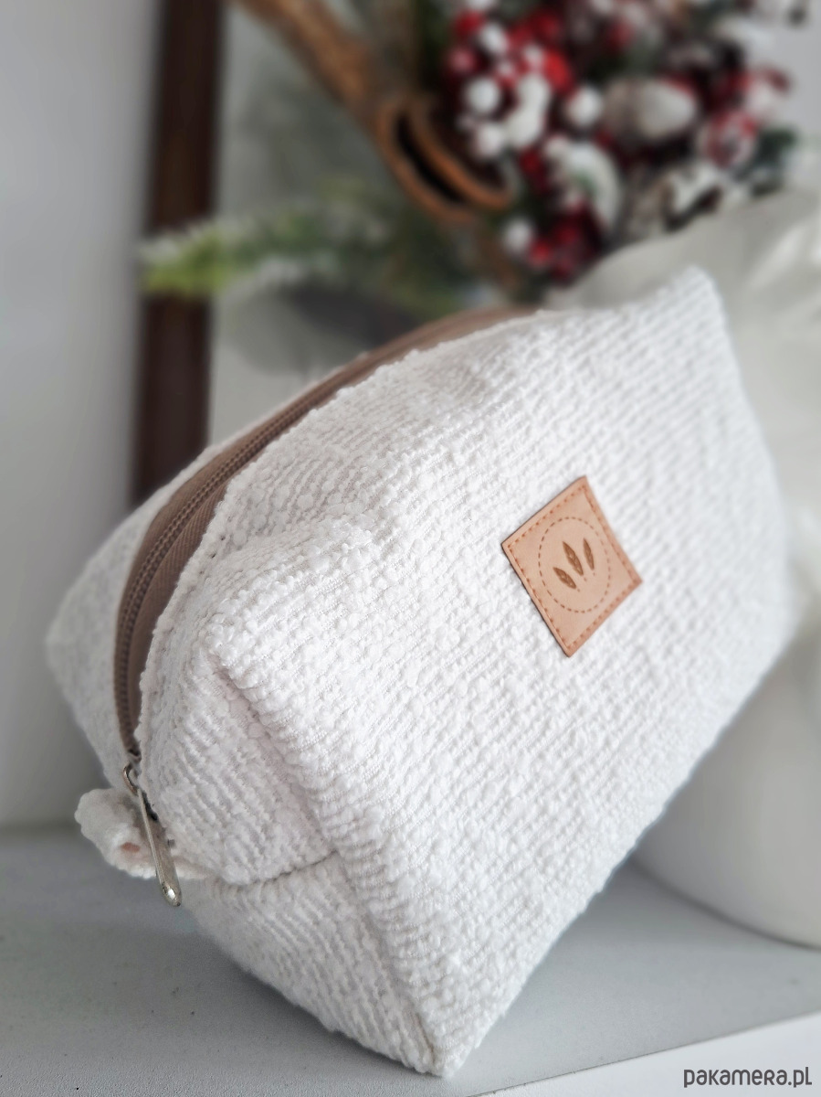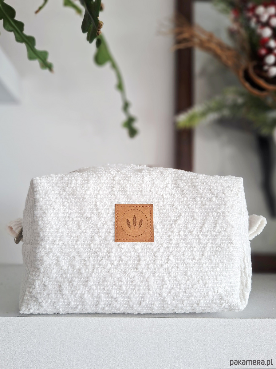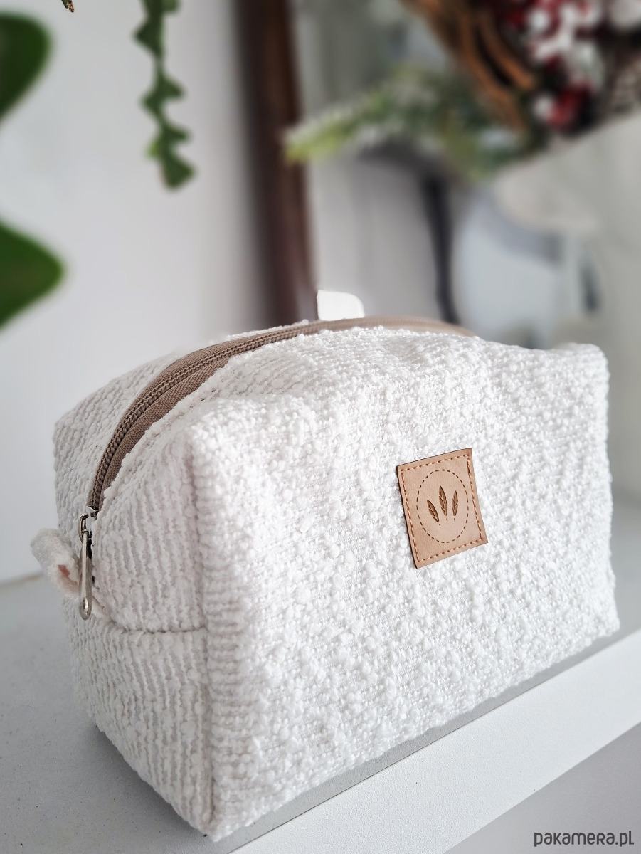 Średniej wielkości kosmetyczka z fantazyjnej tkaniny typu baranek/boucle