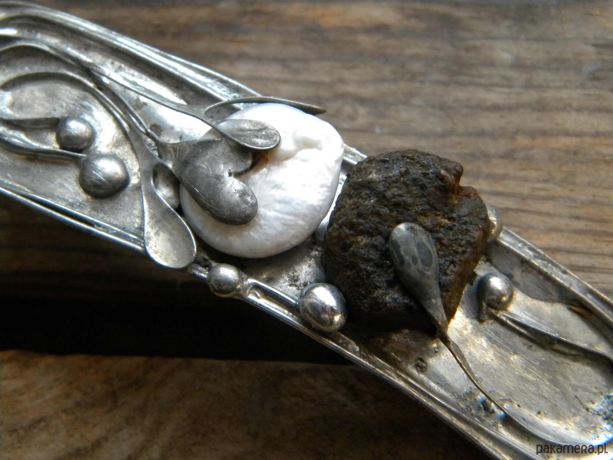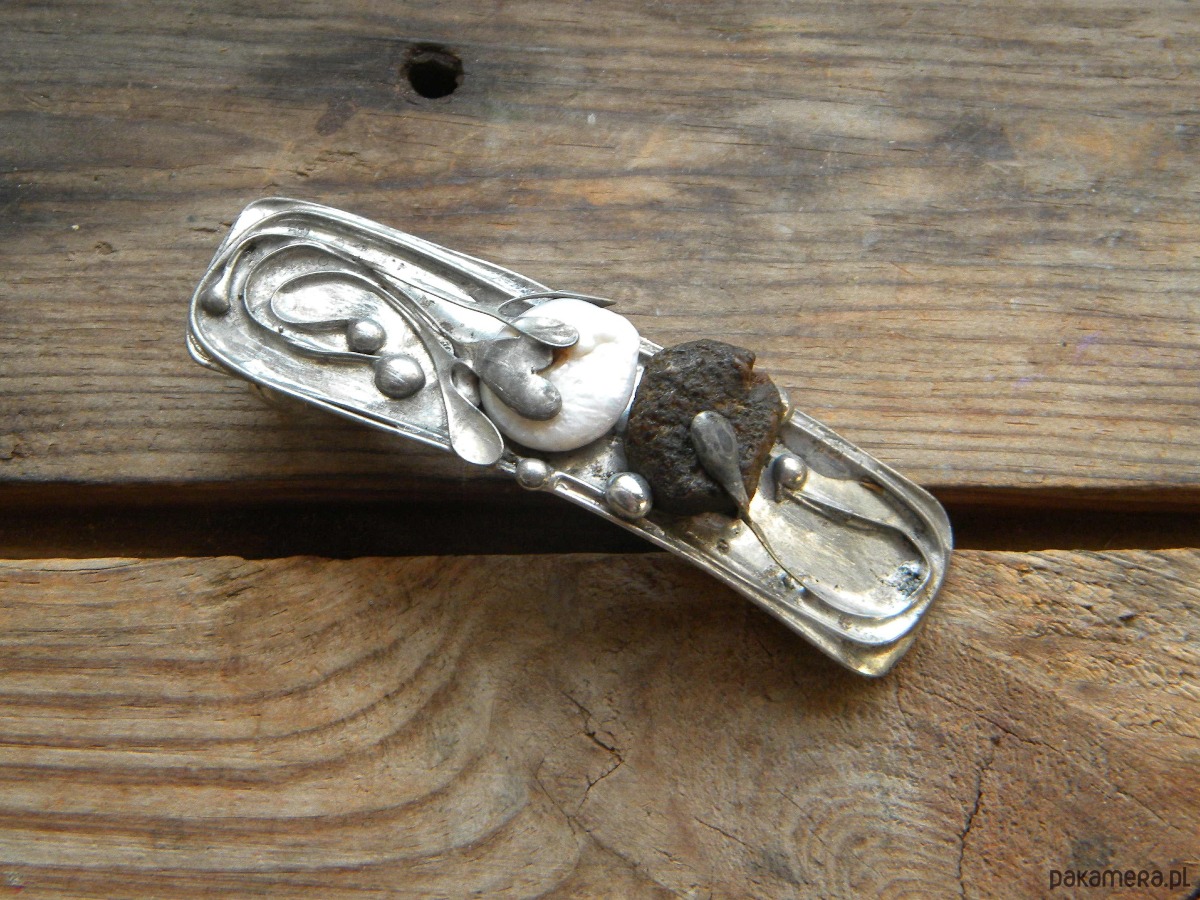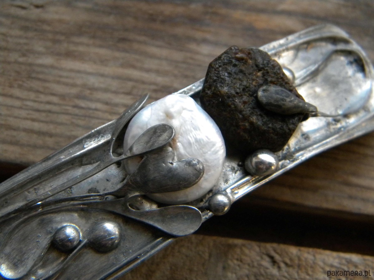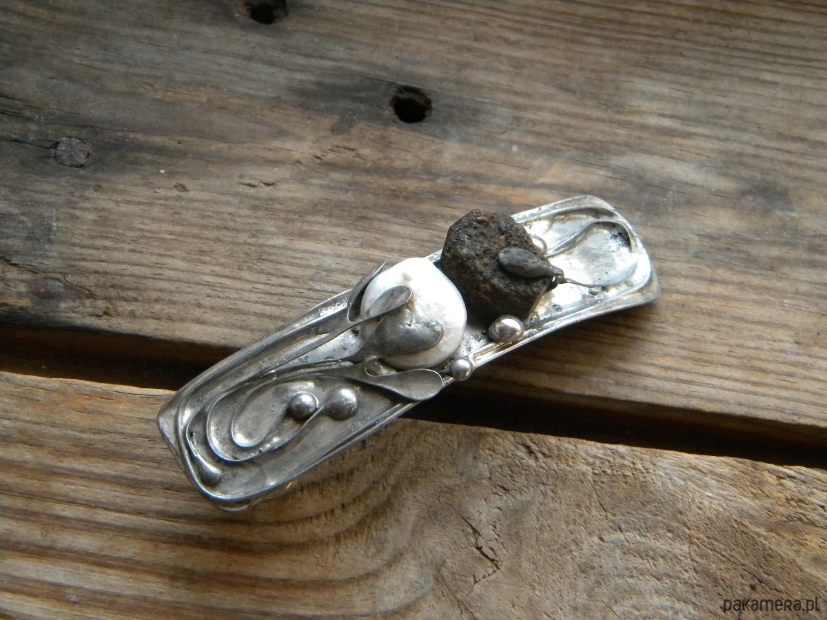 klamra do włosów z perły i surowego bursztynu w ocynowanej miedzi.