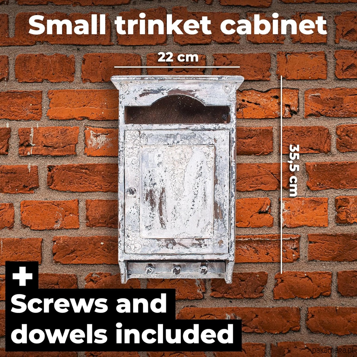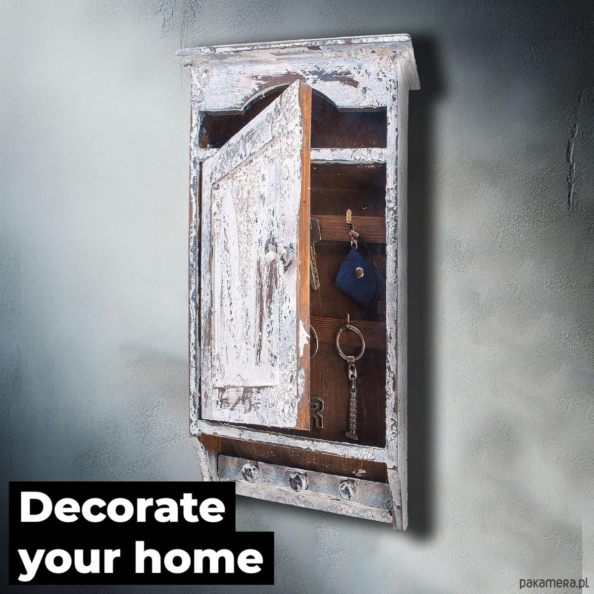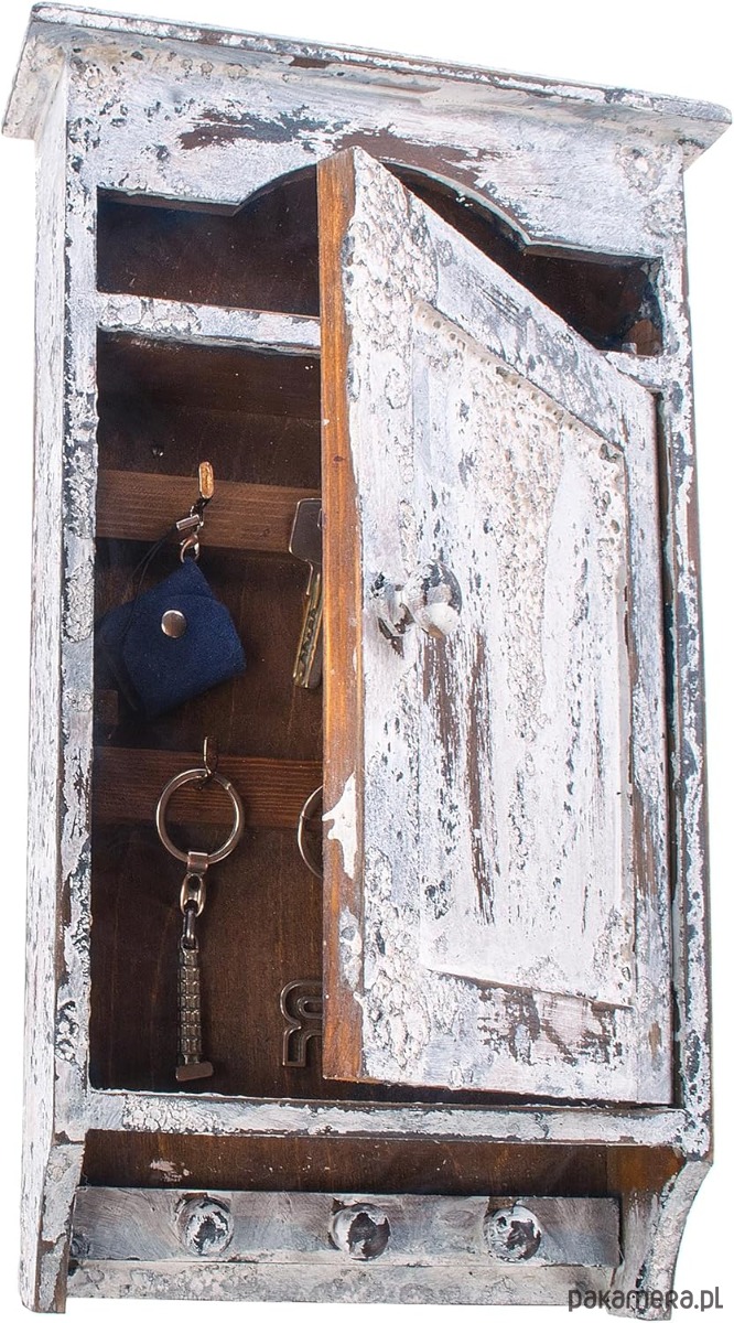 Wieszak na klucze z ekologicznego drewna naturalnego – 6 haczyków wewnątrz szafki + 3 drewniane haczyki montowane na zewnątrz.