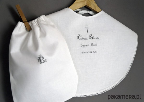 Szatka do chrztu wykonana z białego płótna. Haft w całości wykonany ręcznie. W zestawie woreczek na szatkę.