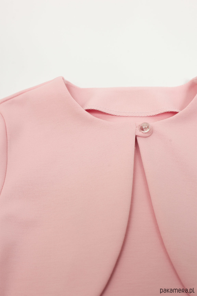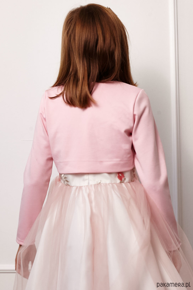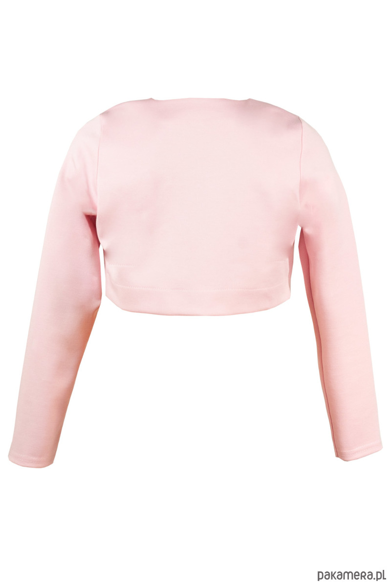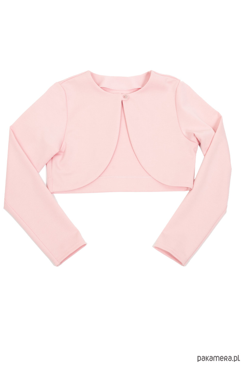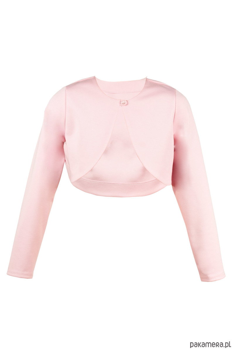 Bolerko wykonane z mięsistej dzianiny punto, idealnie nadaje się do sukienki czy bluzeczki. Z przodu zapinane na guziczek. Fason krótszy nie zasłania sukienki. Idealnie sprawdzi się na chłodniejsze dni.