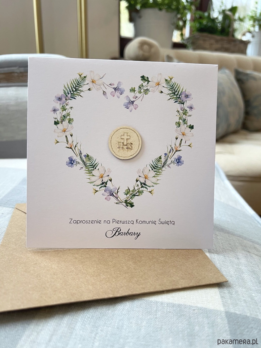 Białe eleganckie zaproszenia komunijne, na komunię ręcznie robione z wiankiem - wianek z personalizacją