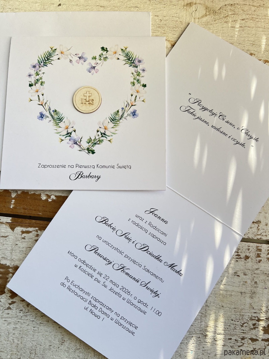 Białe eleganckie zaproszenia komunijne, na komunię ręcznie robione z wiankiem