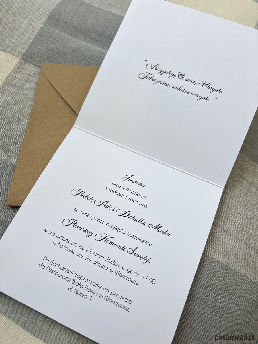 Zaproszenia na komunię o wymiarze 14x14 cm wykonane z białego wysokiej jakości papieru o gramaturze 300.