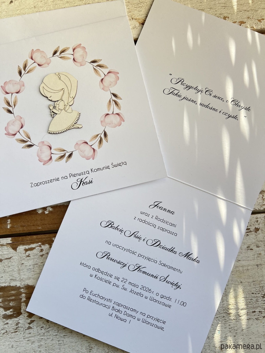 Białe eleganckie zaproszenia komunijne, na komunię ręcznie robione z wiankiem - wianek z personalizacją